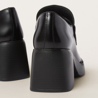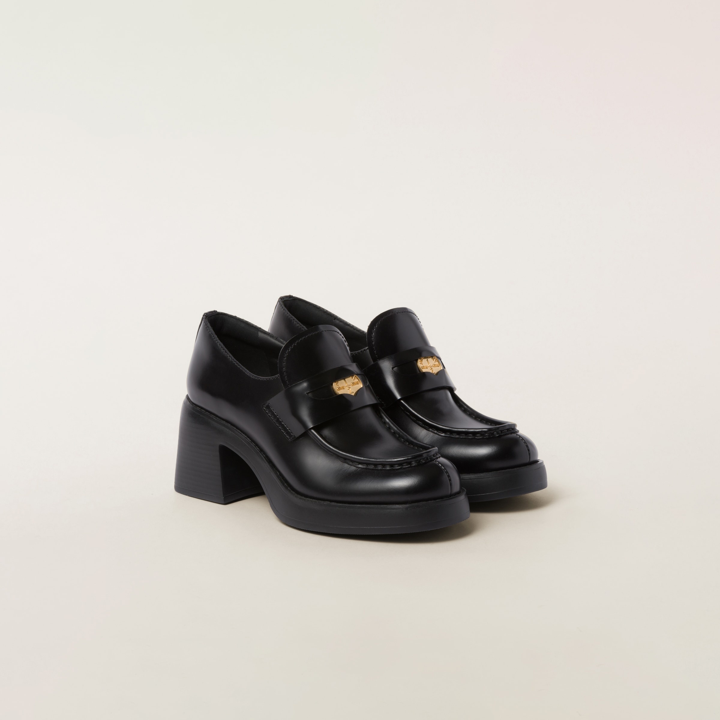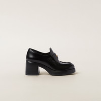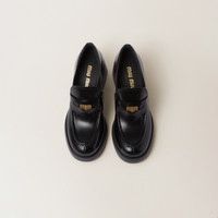 Miu Miu reimagines the iconic loafer in a bold, provocative, and sophisticated version. In the 1950s, loafers were part of the uniform of American prep school and college students. Students against wearing the required attire started inserting a one cent coin in the slot of the band, which led to it being called the Penny Loafer. The presence of the heel adds a touch of charismatic, carefree, and irreverent femininity. - Product code: 5D820D_B4L_F0002_F_DX75 - Apron with leather band and logo-engraved coin - Leather lining - EVA sole - Heel height: 75 mm - Leather insole - Imported