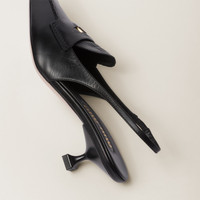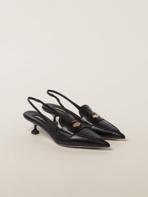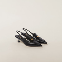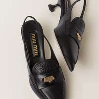 Miu Miu reinterprets the iconic loafer in an ultra-feminine, glamorous and irreverent version. The tapered lines and distinct character are paired with classic details. In the 1950s, loafers were part of the uniform of American prep school and college students. Students against wearing the required attire started inserting a one cent coin in the slot of the band, which led to it being called the Penny Loafer. The embossed logo on the tongue completes the shoe with a distinctive note. - Product code: 5D901D_XUQ_F0002_F_045 - Apron with leather band and metal ornament - Leather lining - Embossed logo on the tongue - Leather sole and rubber heel layer - 45 mm varnished heel - Leather insole - Imported
