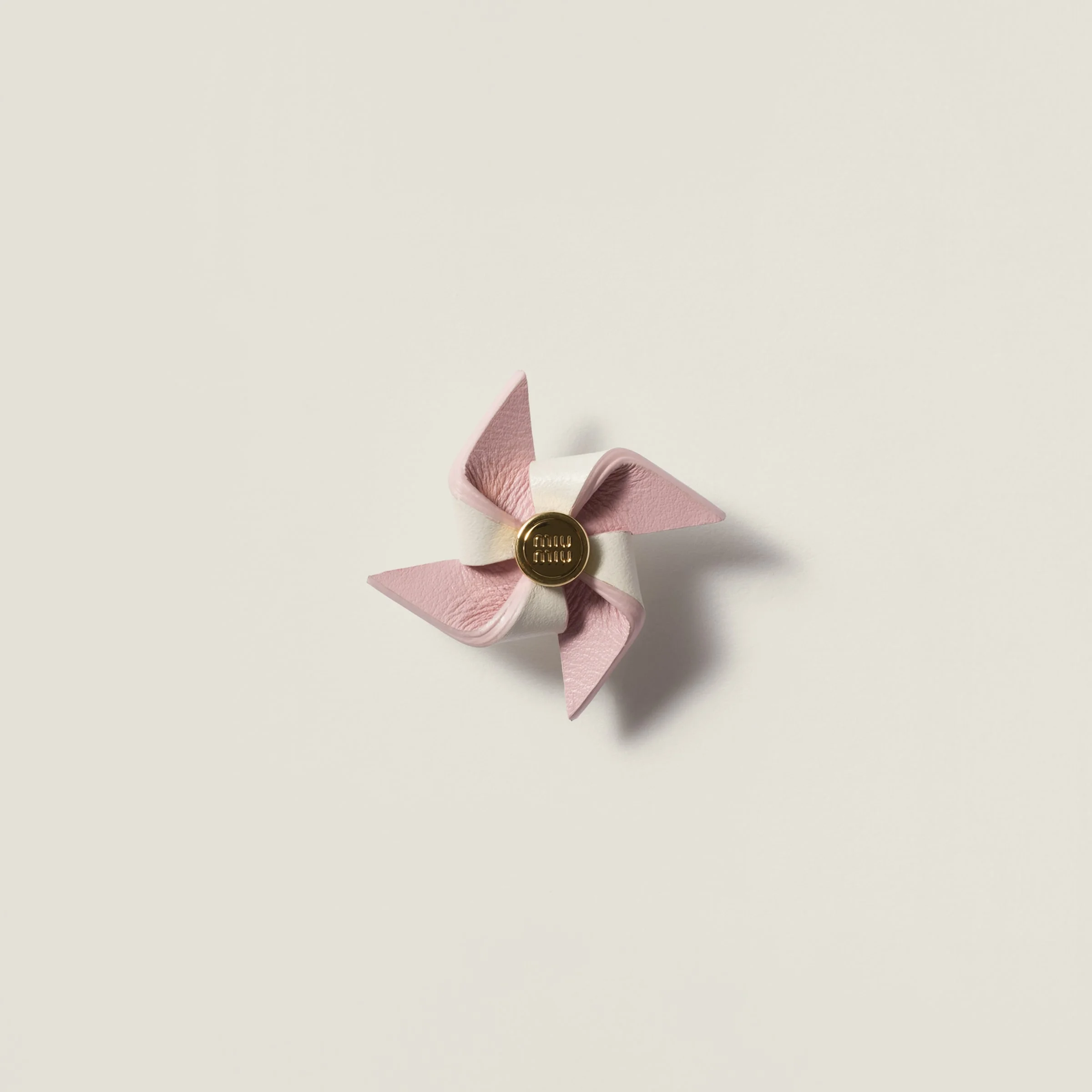 Miu Miu's bold, playful character comes to life in this pinwheel brooch made of two-tone leather with metal logo that enriches the silhouette of sneakers and bags, creating unique style combinations. - Product code: 5IS114_2FLQ_F0V4C - Pin closure on the back - Visible engraved logo - Imported Height 4cm Width 4cm Materials Main material: Calfskin