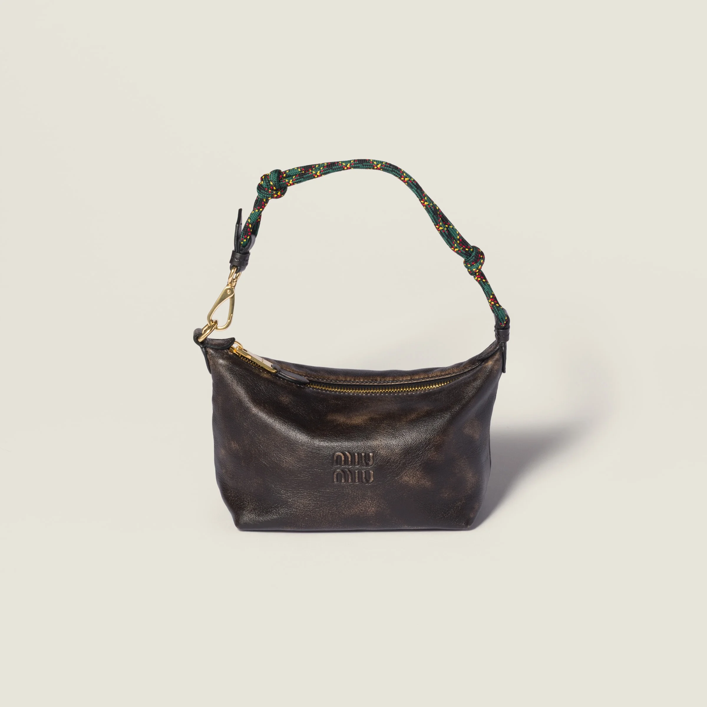 The vintage treatment of nappa leather reinterprets the simple character of this pouch. The versatile and contemporary accessory stands out for the embossed leather logo and the cord strap, an expression of Miu Miu's sporty experimentation. - Product code: 5NE841_2IFO_F0NTG - Vintage-look treatment - Technical cord handle with snap hook - Zipper closure - Cotton satin interior - Embossed lettering logo - Imported Height 14cm Width 18.5cm Length 10cm Materials Main material: Lambskin