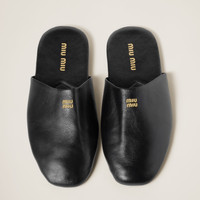 The Miu Miu logo stands out on the front and sole of these leather slippers, adding an iconic note to the design. - Product code: 5S322E_3AP6_F0002_F_A005 - Upper with embossed logo - Leather lining - Screen-printed logo on the insole - Rubber sole - Leather insole - Imported Materials Main material: Buffalo