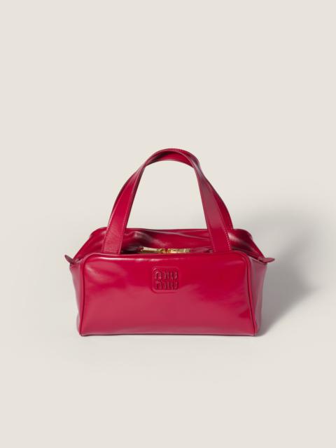 Compact and versatile, this new interpretation of the top-handle bag stands out for its flat handles, the elegant logo on the front and the subtle sheen of soft calf leather, reflecting Miu Miu's sophisticated experimentation. - Product code: 5BB182_2IEO_F0041_V_MOO - Leather handles - Gold-tone hardware - Zipper closure - Cotton satin interior with double zipper pocket - Leather lettering logo on the front - Imported Height 15cm Width 28cm Length 13cm Materials Main material: Calfskin