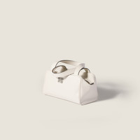 Compact and versatile, this new interpretation of the top-handle bag stands out for its flat handles, the elegant logo on the front and the subtle sheen of soft calf leather, reflecting Miu Miu's sophisticated experimentation. - Product code: 5BB182_2IEO_F0009_V_MOO - Leather handles - Gold-tone hardware - Zipper closure - Cotton satin interior with double zipper pocket - Leather lettering logo on the front - Imported Height 15cm Width 28cm Length 13cm Materials Main material: Calfskin
