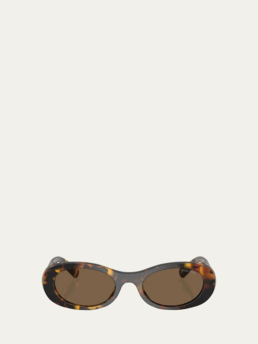 Miu Miu oval sunglasses in acetate and plastic Lens/bridge/temple (in mm): 5020140 Solidcolor lenses; logo on corner Saddle nose bridge Signature raised logo on temples Wide, tapered arms 100% UVA/UVB protection Made in Italy