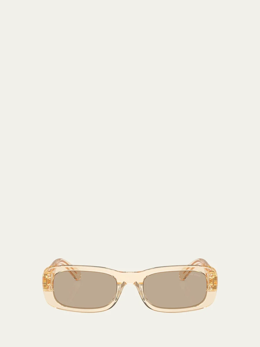 Miu Miu rectangular sunglasses in acetate Lens/bridge/temple (in mm): 5320140 Solid lenses; logo on corner Saddle nose bridge Logo on temples Thin, tapered arms 100% UVA/UVB protection Made in Italy