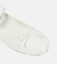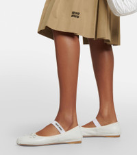 These ballet flats from Miu Miu are made from white leather with purposefully folded toes for an unfinished touch. The slip-on style is topped with logo-jacquard straps and bordered with grosgrain trims. Product Details - Lining: leather - Toe shape: round toe - Sole: leather insole and sole - Closure: elasticated strap - Upper: leather - Designer color name: Bianco - Comes with a box - Made in Italy - Item number: P00782798 Size & Fit - Fits slightly large to size - we recommend trying a half size smaller - European sizes