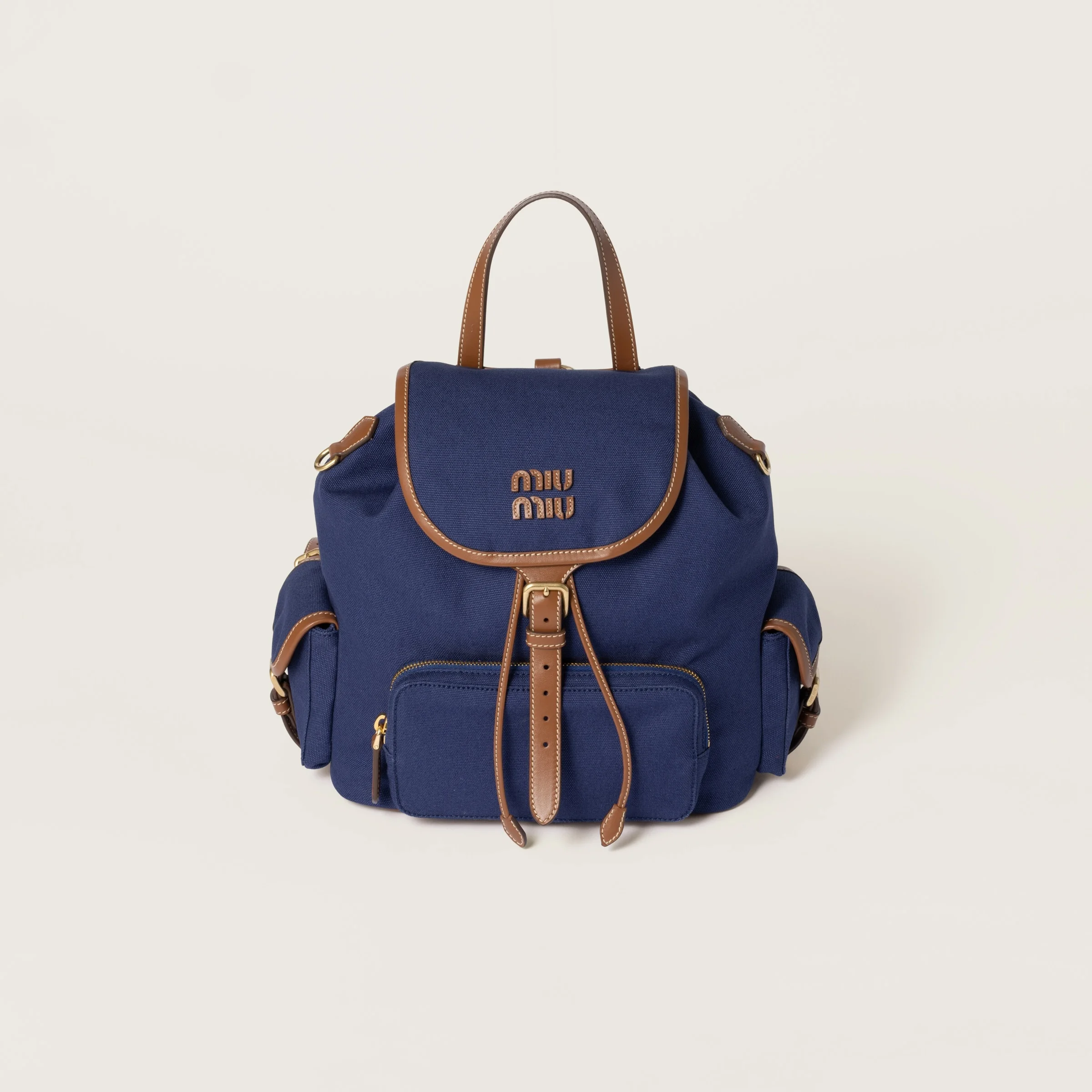 This canvas and leather backpack inspired by school gear recalls childhood and combines a refined and functional aesthetic. The distinctive multi-pocket design embodies the contemporary and playful spirit of Miu Miu bags. - Product code: 5BZ042_2IBQ_F0TQF_V_OOO - Leather handle - Front zipper pocket - Side flap pockets - Gold-tone hardware - Flap closure with buckle - Linen blend interior with zipper pocket - Classic backpack harness with shoulder straps, minimum length 67 cm, maximum length 76 cm - Leather lettering logo on the flap - Imported Height 29.5cm Width 25cm Length 12.5cm Materials Main material: Cotton