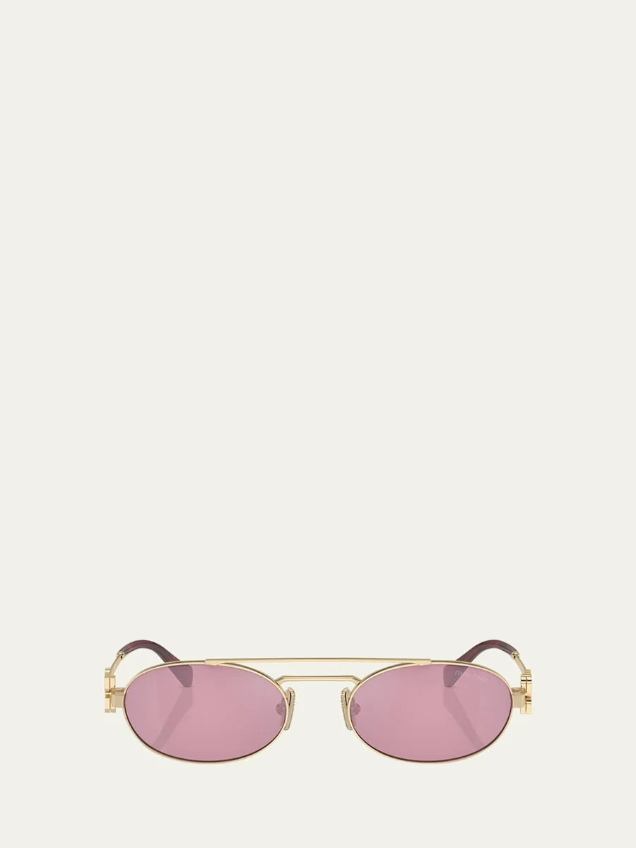 Miu Miu "MU 54ZS" oval aviator sunglasses in metal Lens/bridge/temple (in mm): 53-19-140 Solid lenses; logo on corner Adjustable nose pads Logo on temples Capped earpieces 100% UVA/UVB protection Made in Italy Proposition 65 warning for California residents Online Inquiries: BGS21_D5JMV| Store Inquiries: #4672276
