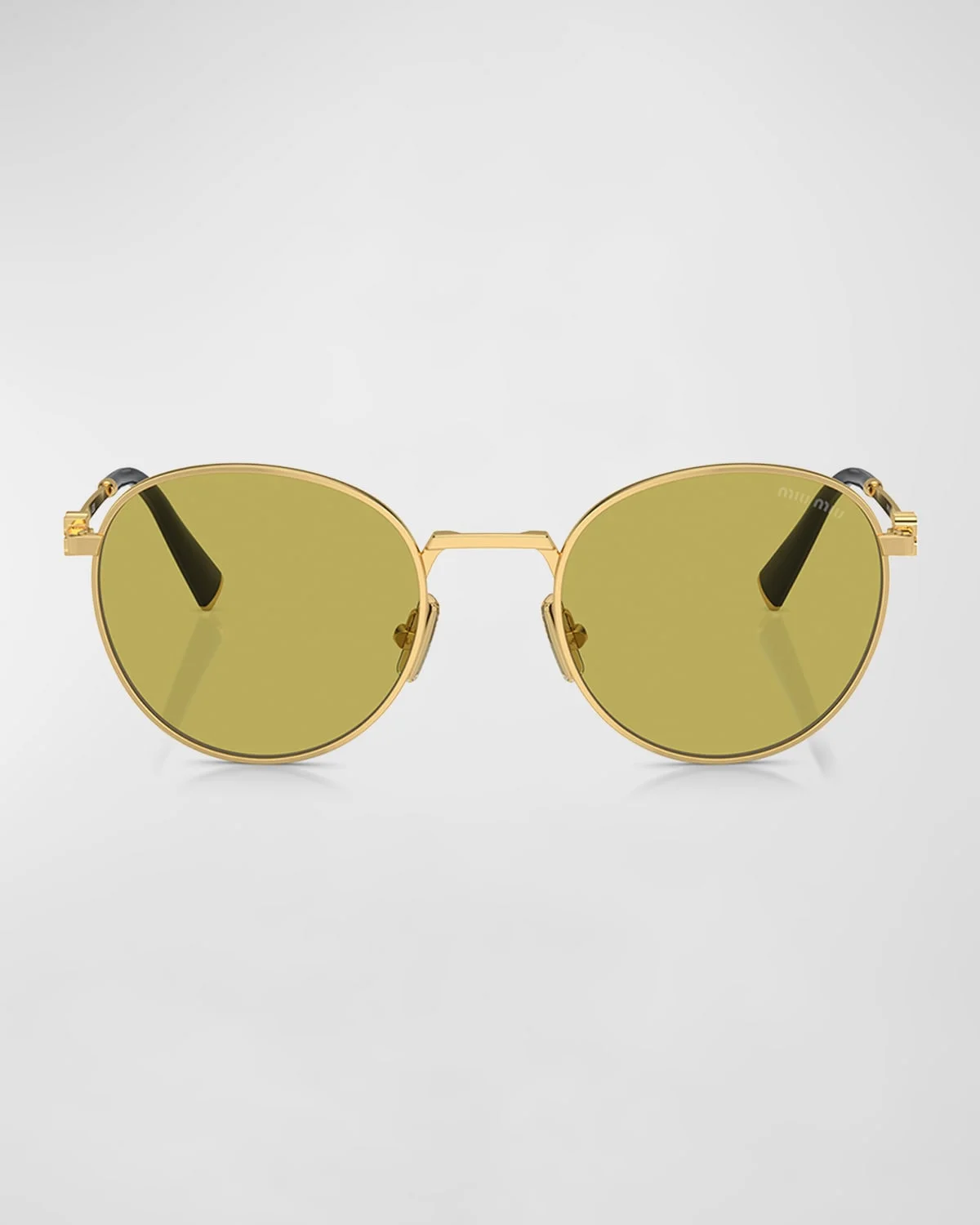 - Miu Miu "MU 55ZS" round sunglasses in metal and plastic - Eye/bridge/temple (in mm): 50-20-140 - Solid lenses; logo on corner - Adjustable nose pads - Vertical logo at temples - Thin, metal arms - Capped earpieces - 100% UVA/UVB protection - Made in Italy - Proposition 65 warning for California residents