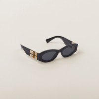 These oval acetate sunglasses embody bold, sophisticated femininity. The low profile frame front is accented with the new Miu Miu vertical logo integrated in the hinge of the thick temples. - Product code: SMU11W_E1AB_F05S0_C_054 - Acetate frame front in black - Frame not compatible with graduated lenses - 100% UVA / UVB protection - Full Fit - Lens-nose-temple measurement: 54-21-135 mm - Article comes with dedicated packaging - Other available colors - Imported Materials Main material: Acetate
