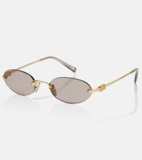 Miu Miu has taken the world by storm with its future-forward approach to design and expressions of personal identity. Complete with logos at the temples, these sunglasses have gold-toned wire frames and oval lenses. Product Details - Frame material: metal - Frame color: gold - Lens filter category 1 - Lens color: pink - Made in Italy - Includes: logo-embossed hard case - The color of the case may vary - Item number: P01111601 Size & Fit - Lens width: 51mm-2" - Bridge size: 20mm-0.8" - Earpiece length: 140mm-5.5"