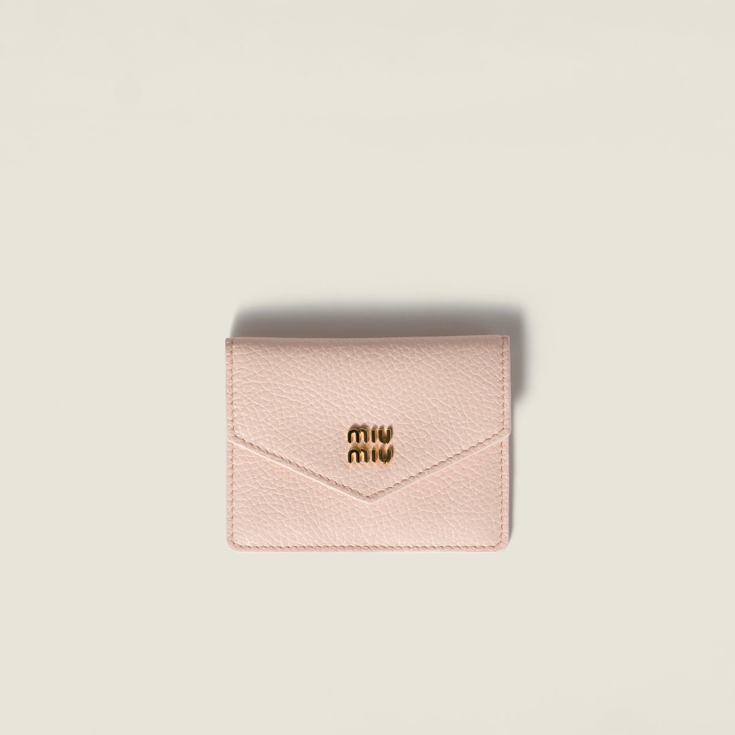 The simple charm of this card holder combines the uniqueness of soft leather and the gold-tone metal logo that makes the accessory a symbol of Miu Miu style. - Product code: 5MF031_ADT7_F0LOZ - One card slot - One internal pocket - External pocket with card slot - Snap closure - Moire lining - Metal lettering logo - Imported Height 8.5cm Width 10.5cm Materials Main material: Calfskin