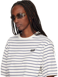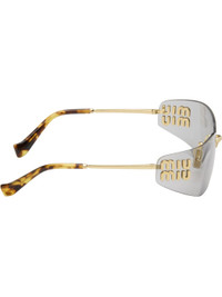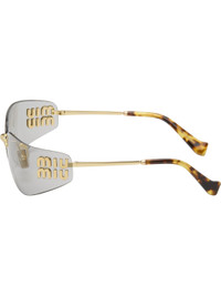 Wraparound oval rimless sunglasses. · Gray tinted lenses · Logo hardware at lens · Adjustable rubber nose pads · Tortoiseshell acetate temple tips · Includes pouch · Size: 75.14 110 Supplier color: Gold/Light grey Metal. Made in Italy 261209F005041