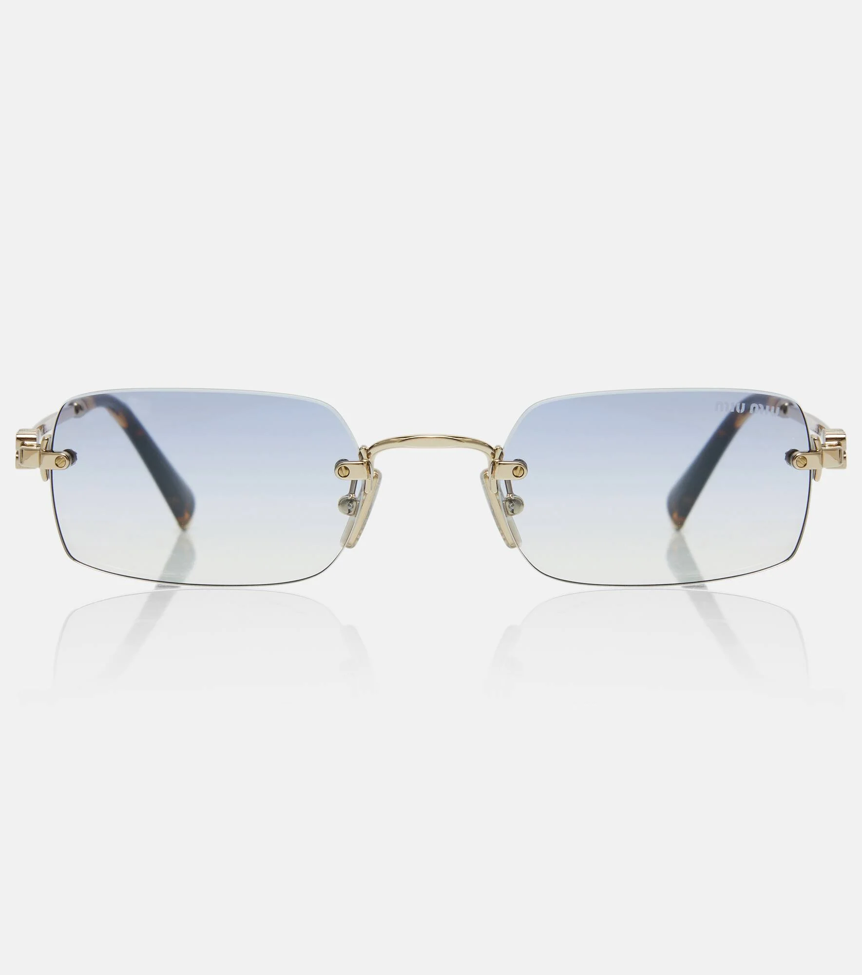 Miu Miu has taken the world by storm with its future-forward approach to design and expressions of personal identity. Complete with logos at the temples, these sunglasses have gold-toned wire frames and rectangular lenses. Product Details - Frame material: metal - Frame color: gold - Lens filter category 2 - Lens color: blue - Made in Italy - Includes: logo-embossed hard case , cleaning cloth - Each piece is unique and prints may differ slightly from those shown - Item number: P01111544 Size & Fit - Lens width: 52mm-2.05" - Bridge size: 20mm-0.8" - Earpiece length: 140mm-5.5"