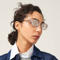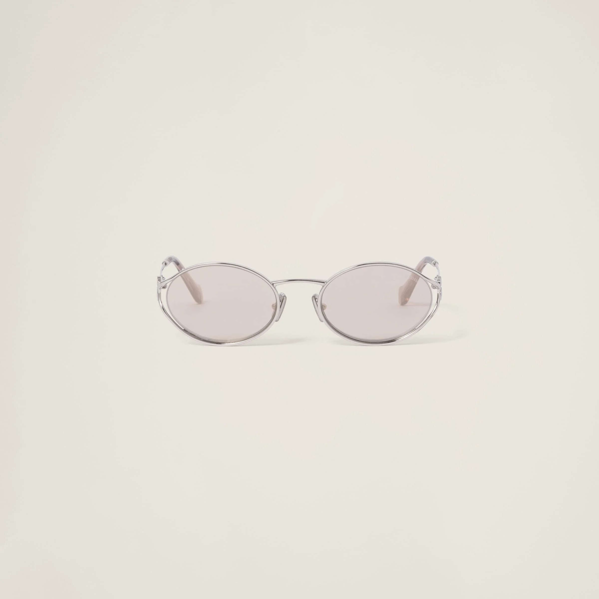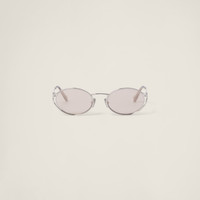 Metal sunglasses with sophisticated allure. The frame is emphasized by thin metal rims that separate from the trendy oval lenses before meeting up again with the new vertical Miu Miu logo integrated into the hinge of the straight temples. - Product code: SMU52Y_M1BC_FE10F_C_054 - Frame not compatible with graduated lenses - 100% UVA / UVB protection - Adjustable nose pads suitable for any fit - Lens-nose-temple measurements: 54-21-125 mm - Article comes with dedicated packaging - Other colors available - Imported Materials Main material: Metal