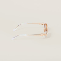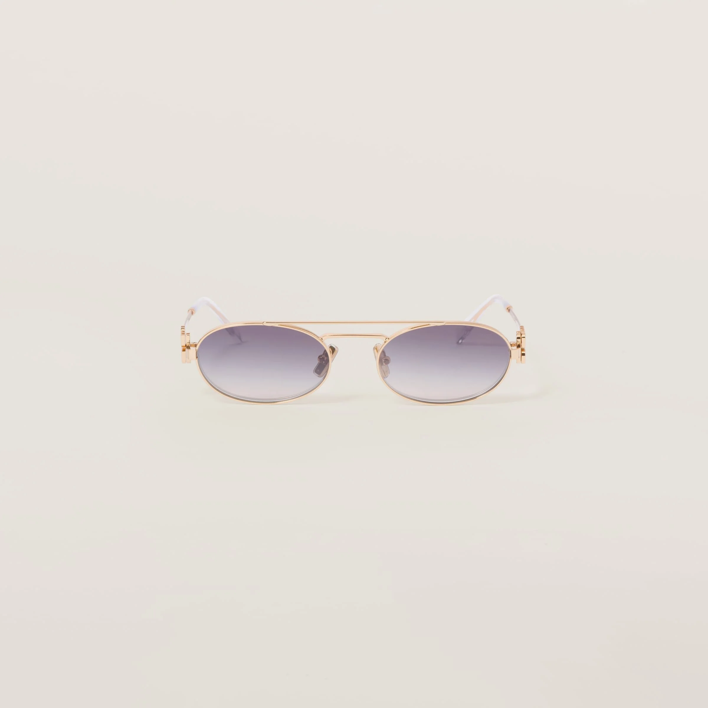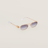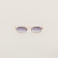 Metal sunglasses with retro allure. The intrepid narrow oval front has a sophisticated double bridge and is paired with thin temples embellished with the vertical Miu Miu logo. - Product code: SMU54Z_E5AK_FE30C_C_053 - Metal frame front - Color: Gold - Frame compatible with graduated lenses - 100% UVA / UVB protection - Adjustable nose pads suitable for any fit - Lens-nose-temple measurements: 53-19-140 mm - Article comes with dedicated packaging - Other available colors - Imported Materials Main material: Metal