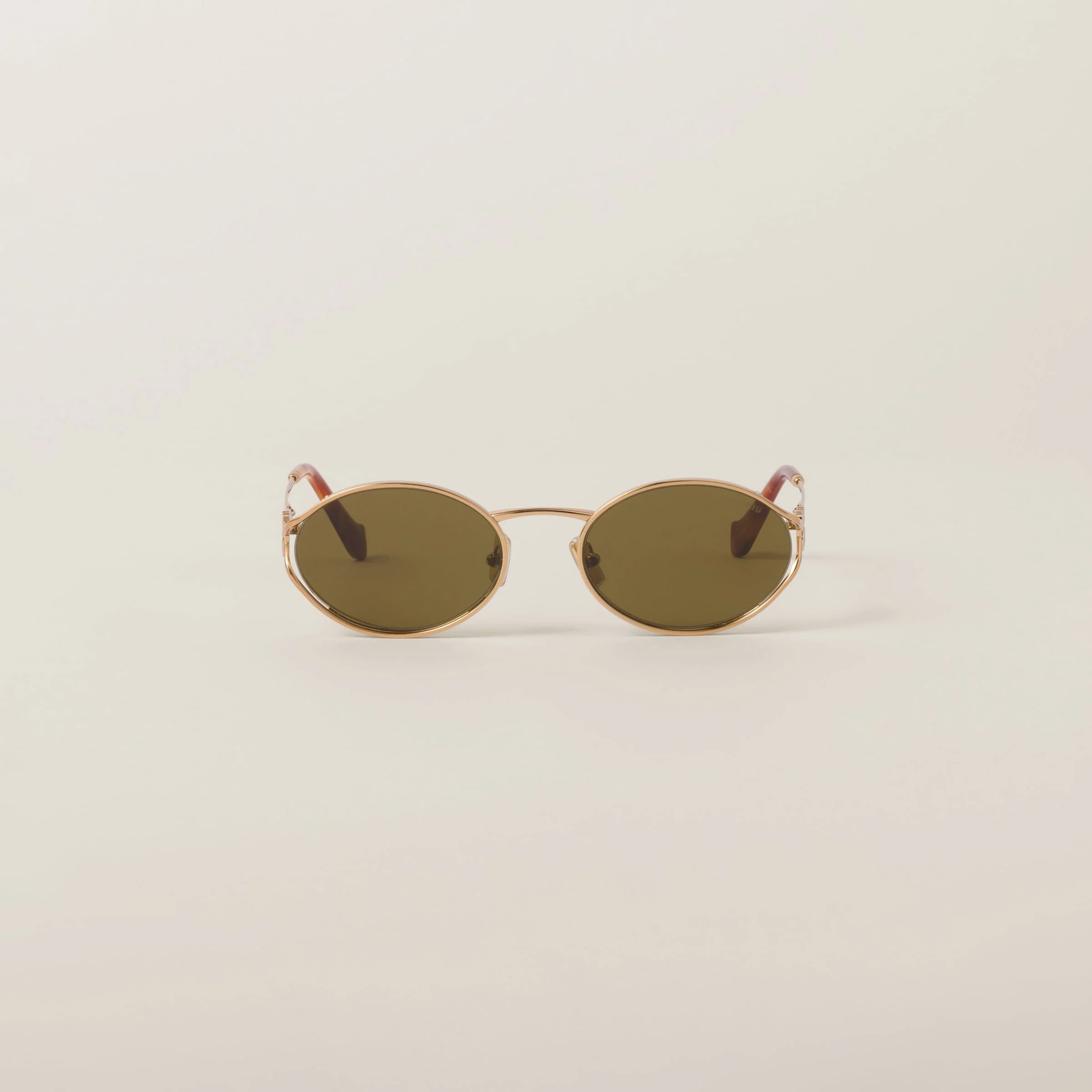Metal sunglasses with sophisticated allure. The frame is emphasized by thin metal rims that separate from the trendy oval lenses before meeting up again to create the new vertical Miu Miu logo integrated into the hinge of the straight temples. - Product code: SMU52Y_E7OE_FE01T_C_054 - Metal frame front - Color: Brass - Frame not compatible with graduated lenses - 100% UVA / UVB protection - Adjustable nose pads suitable for any fit - Lens-nose-temple measurement: 54-21-125 mm - Article comes with dedicated packaging - Other available colors - Imported Materials Main material: Metal