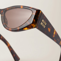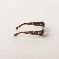Rectangular sunglasses with an ultra-glamorous attitude. The acetate frame front has a cat-eye silhouette emphasized by refined facets. Bold temples are embellished with the vertical Miu Miu logo. - Product code: SMU06Y_EVAU_FE06B_C_054 - Acetate frame front in Honey Tortoiseshell - Frame not compatible with graduated lenses - 100% UVA / UVB protection - Standard fit - Lens-nose-temple measurement: 54-16-140 mm - Article comes with dedicated packaging - Other available colors - Imported