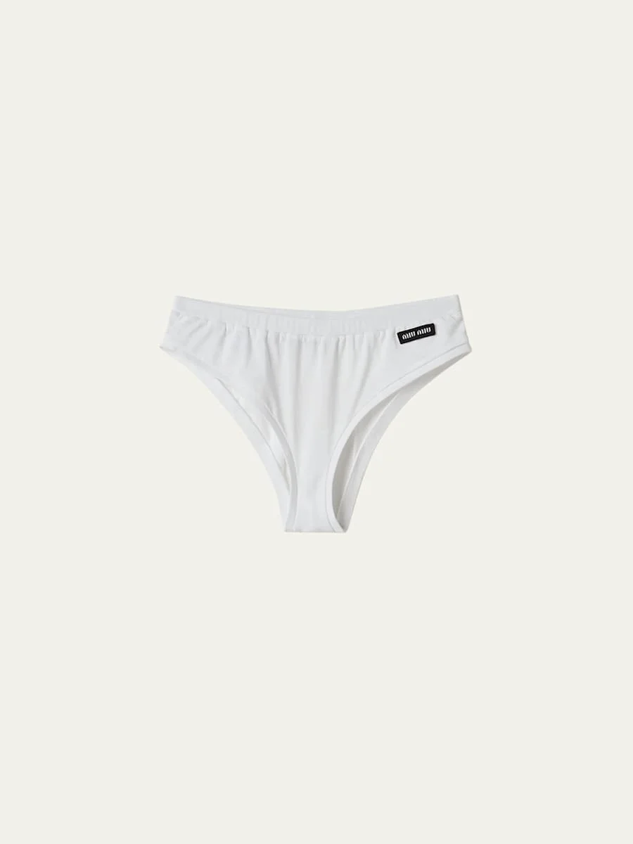Miu Miu jersey briefs featuring a contrast logo tab Low rise Banded waist Cheeky seat coverage Pullon style Cotton Hand wash or dry clean Made in Italy