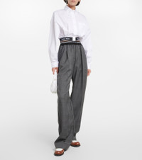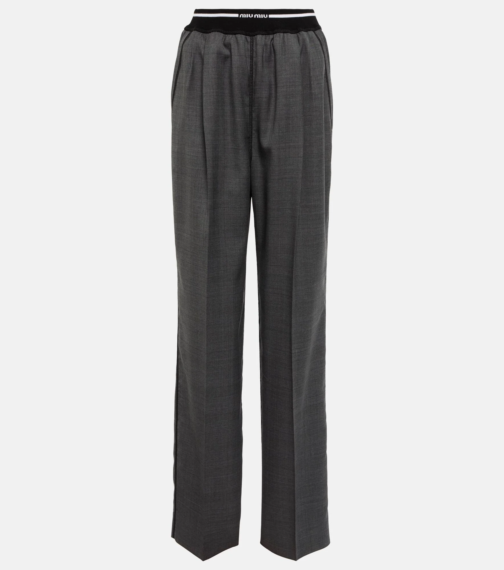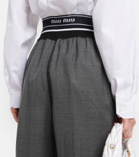Master sports-luxe tailoring with these wide-leg pants from Miu Miu. Made from a technical fabric in an easy-to-style checked pattern, the design has an elasticated logo intarsia waist and sharply pressed pleats through the legs. Product Details - Made in Italy - Material: 100% virgin wool - Pockets: side slit pockets - Designer color name: Ardesia - Elasticated waistband - Pocket lining: 100% viscose - Care instructions: dry clean - Item number: P00753180 Size & Fit - Fits large to size - we recommend trying one size smaller - Elasticated waist - Wide-leg - High-waisted - The model seen in the picture is 178cm-5'10" and wearing a size IT 38