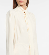 This midi dress from Miu Miu exudes romantic charm with its self-tie ribbon at the neckline. In a fluid and slightly flared length, this style comes in a cream colorway. Product Details - Made in Italy - Closure: zipped back - Material: 74% acetate, 26% viscose - Designer color name: Crema - Care instructions: dry clean - Self-tie collar - Item number: P00594853 Size & Fit - Fits large to size - we recommend trying one size smaller - Semi-sheer - Cinched waist - The model seen in the picture is 178cm-5'10" and wearing a size IT 38