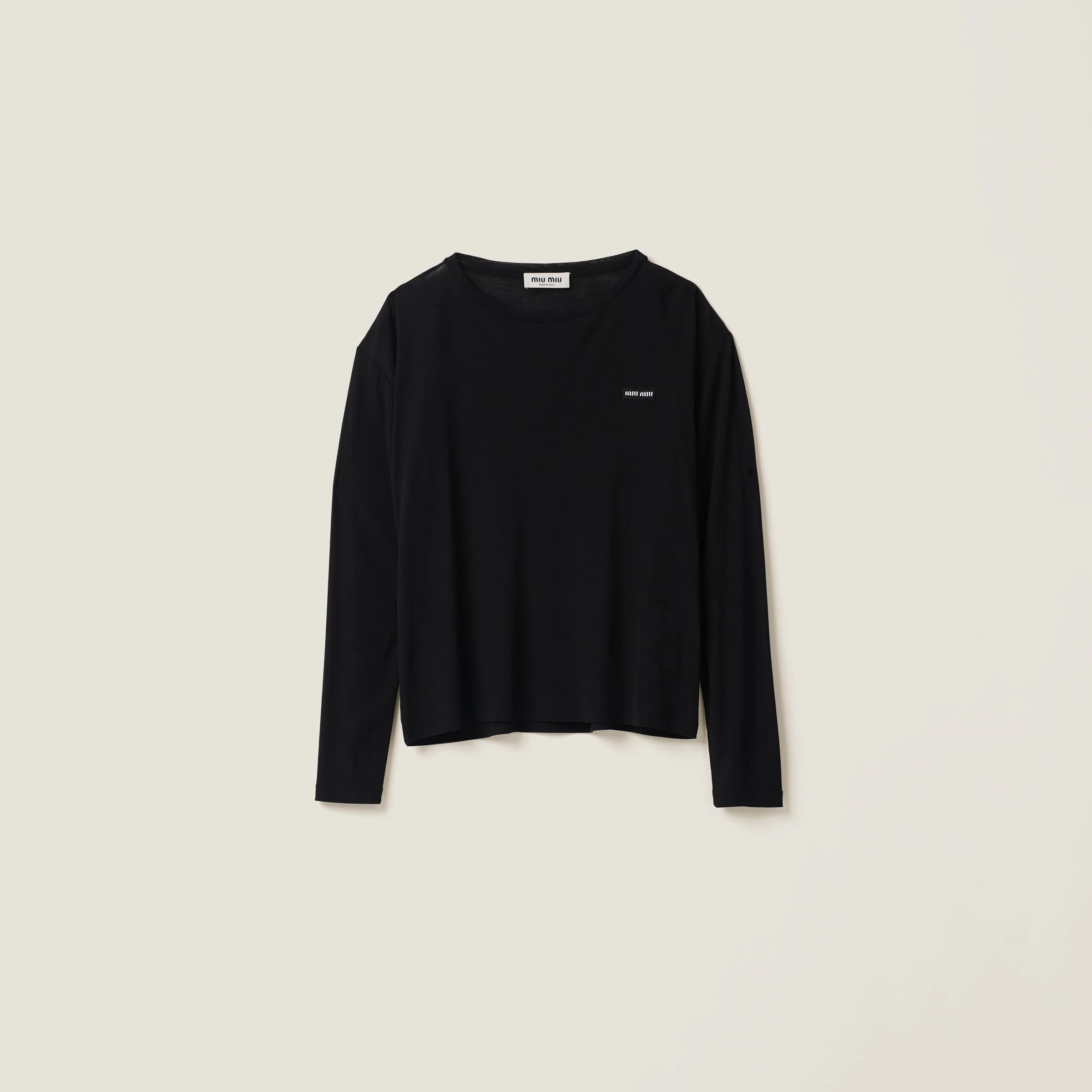 Miu Miu's logo patch enriches the simple lines of this tee, adding an iconic and distinctive character to the garment. - Product code: MJL939_133O_F0002_S_231 - Straight fit - Crew-neck - Long sleeve - Logo patch - Twin-needle hem - Imported Height 64cm Materials Main material: 100% Cotton