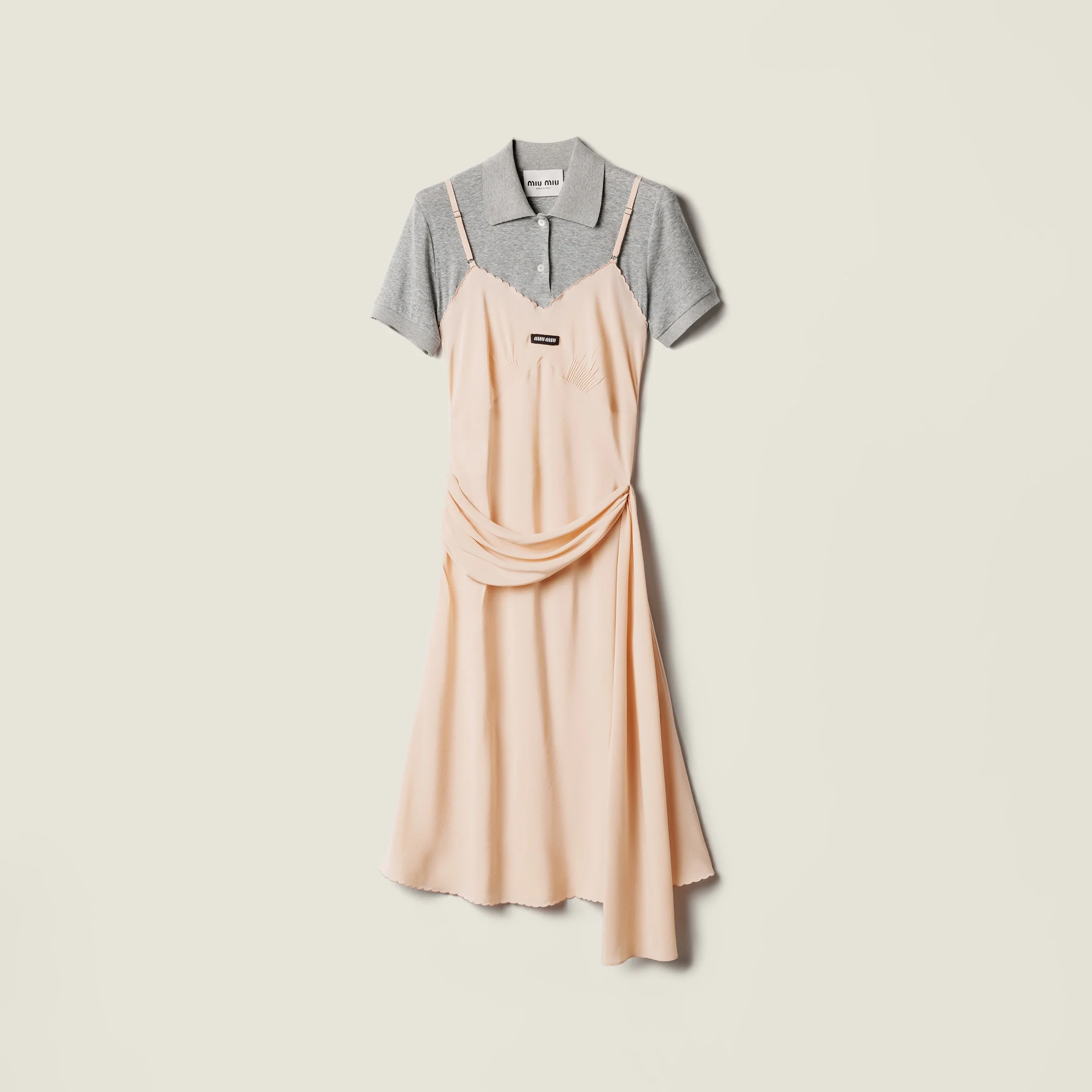 Inspired by the combinations of the Upcycled collection, this dress combines the elegant draping of marocain crepe with a modern ribbed jersey polo shirt, interpreting the codes of bold, experimental femininity. - Product code: MF6119_18JK_F04W7_S_OOO - Polo shirt collar - Front button closure - Attached jersey polo shirt - Short sleeves - Embroidered neckline - Adjustable straps - Knit logo label - Imported - The model is 177 cm tall and wears a size 38 Materials Main material: 100% Silk