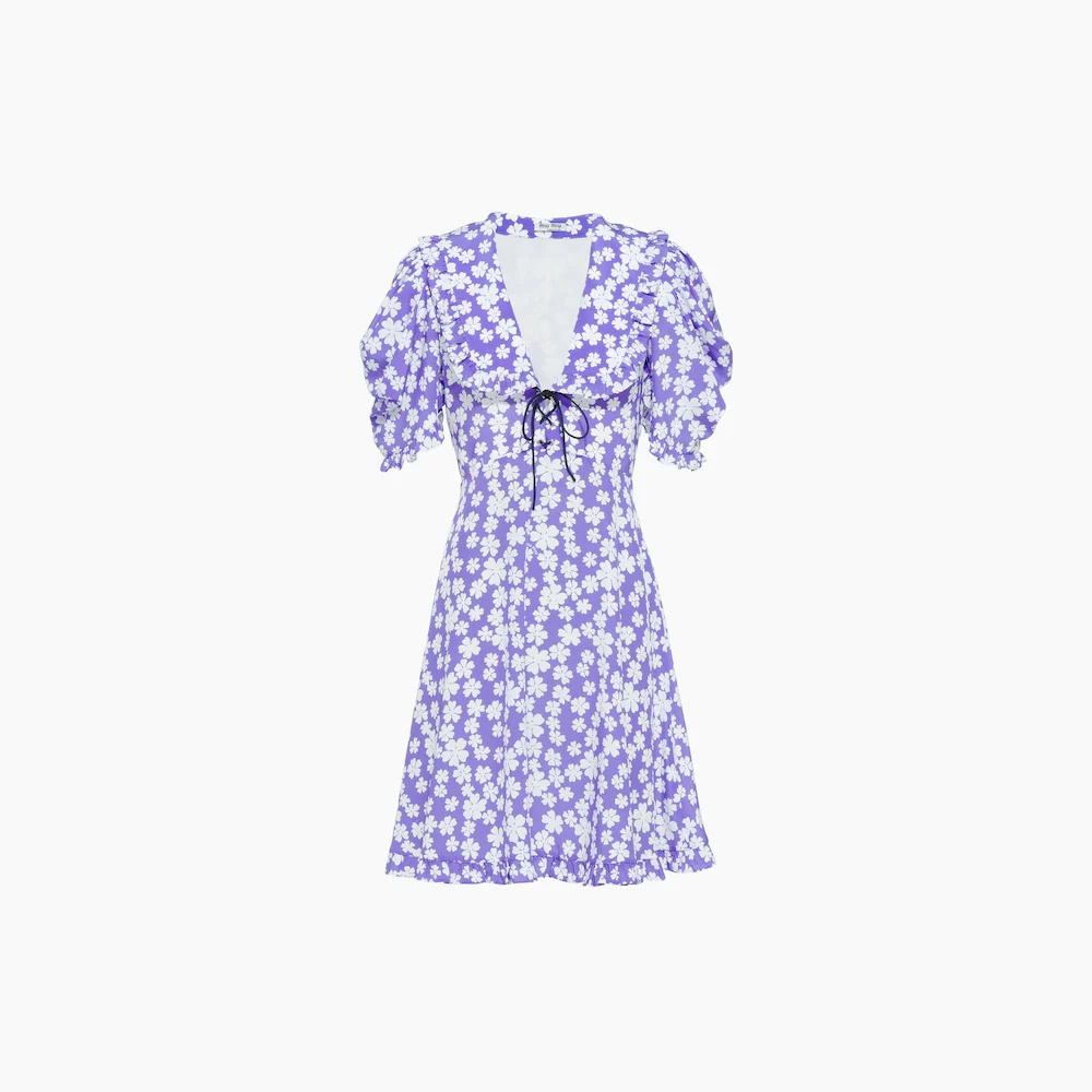 Puffy sleeves create romantic volumes and characterize this marocain dress. The vivacious floral print accents the garment, bringing summer to mind. - V-neck - Front closure with laces - Side zipper closure - Short sleeves - Hem with ruching Height 90 cm The model is 178 cm tall and wears a size 38 Product code MF4527_10MA_F02U0