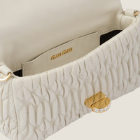 Sparkling crystals embellish the chain shoulder strap and define the sophisticated design of the Miu Crystal nappa leather bag. The quilted motif adds an iconic note to the bag. - Product code: 5BP079_FVJ_F097W_V_OOO - Cloquet workmanship - Detachable 110 cm metal chain shoulder strap with crystals - Gold-tone/steel hardware - Metal lettering logo on the back - Logo-engraved turn-lock clasp - Cotton satin lining with patch pocket - This bag can hold a phone 14cm x 7.1cm x 0.77cm in size - The Miu Miu card holder easily fits in this bag - Imported Height 9cm Width 17cm Length 3.5cm Materials Main material: Lambskin