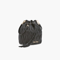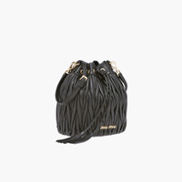 Characterized by its iconic shape, this leather bucket bag with drawstring stands out for its refined matelassé motif. The leather shoulder strap with metal hardware accents the bag. - Matelassé nappa leather - Drawstring closure with tassels - 110 cm adjustable and detachable leather shoulder strap - Metal lettering logo - Cotton satin lining - Inside pocket - This bag can hold a phone 16cm x 7.8cm x 0.74cm in size - The small Miu Miu wallet can easily fit in this bag Height 18 cm Width 20 cm Product code 5BE014_N88_F0002_V_OOO