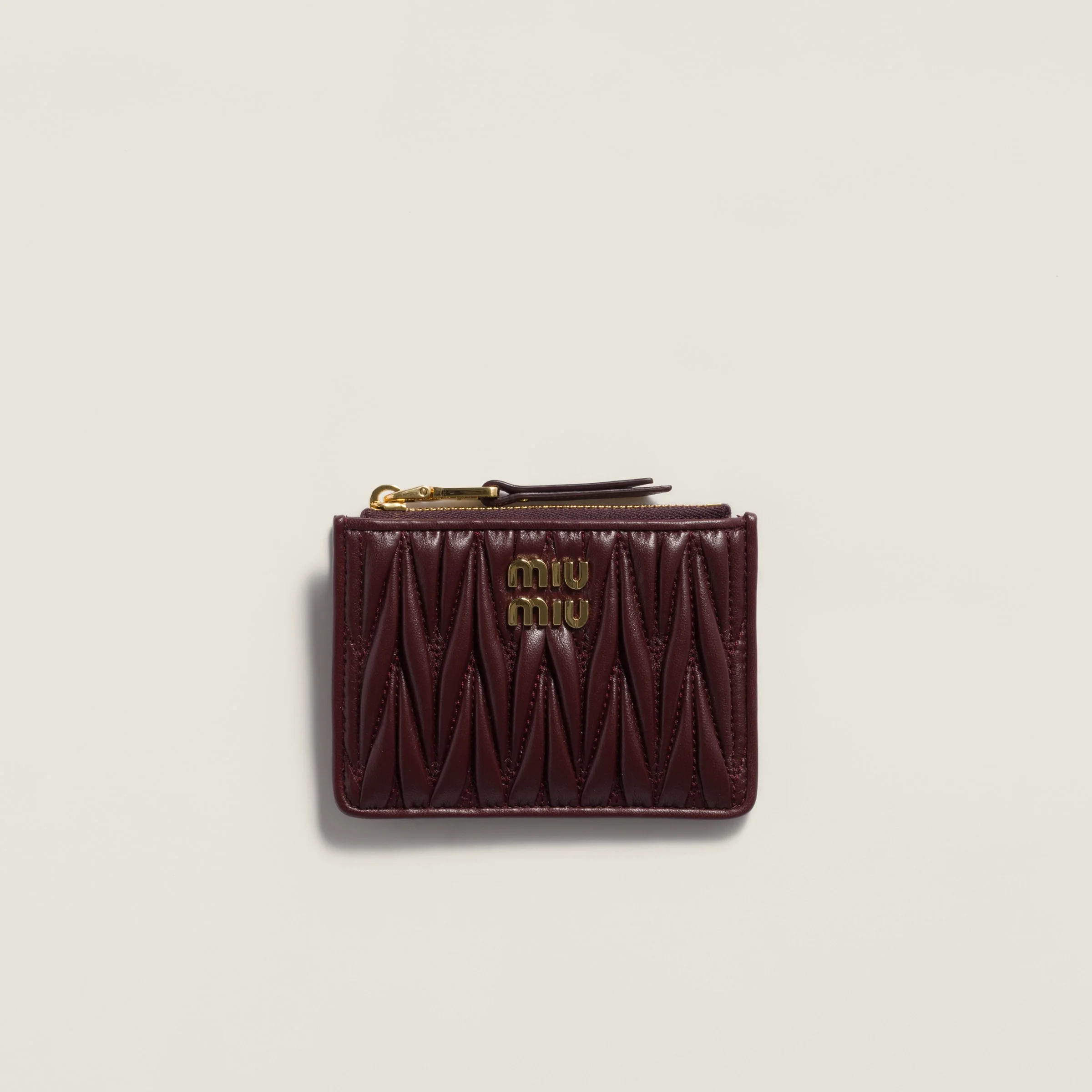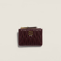 The iconic matelasse motif reflects Miu Miu's refined artisan codes, enhancing the sleek, elegant design of this nappa leather card holder. - Product code: 5MC093_AFPP_F0007 - Matelasse workmanship - With removable metal key ring - Zipper closure - Three card slots - External zipper pocket - Moire lining - Metal lettering logo - Imported Height 8cm Width 11cm Materials Main material: Lambskin