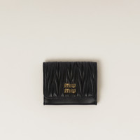 The iconic matelasse motif reflects the codes of Miu Miu's refined workmanship, enhancing the elegant and simple design of this nappa leather card holder. - Product code: 5MC104_AFPP_F0002 - Matelasse motif - Four card slots - One internal pocket - One external pocket - Moire lining - Snap closure - Metal lettering logo - Imported Height 8.5cm Width 10.5cm Materials Main material: Lambskin