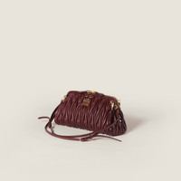 The purity of form and the refined matelasse craftsmanship encapsulate the essence of this nappa leather clutch, which can be worn over the shoulder or carried by hand, where fashion show inspirations and functional experimentation blend into the distinctive features of Miu Miu style. - Product code: 5BF130_AN88_F0007_V_OLO - With double sliding and removable Ayers leather shoulder strap. Minimum length: 60 cm - Maximum length: 70 cm - Minimum drop: 26 cm - Maximum drop: cm - Gold-tone hardware - Zipper closure - Cotton satin lining with double zipper pocket - Embossed lettering logo on the front - Imported Height 14.5cm Width 28cm Length 10cm Materials Main material: Lambskin