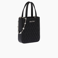 A structured design and iconic workmanship of the brand characterize this matelassé nappa leather handbag. The deluxe chain illuminated with crystals completes the accessory. - Matelassé motif - Leather handles - Detachable 110 cm metal chain shoulder strap with crystals - Steel hardware - Metal lettering logo on the front - Cotton satin lining with patch pocket - This bag can hold a phone 16cm x 7.8cm x 0.74cm in size - The small Miu Miu wallet can easily fit in this bag Height 17.5 cm Width 15 cm Length 5 cm Product code 5BA220_2CE3_F0002_V_OOO