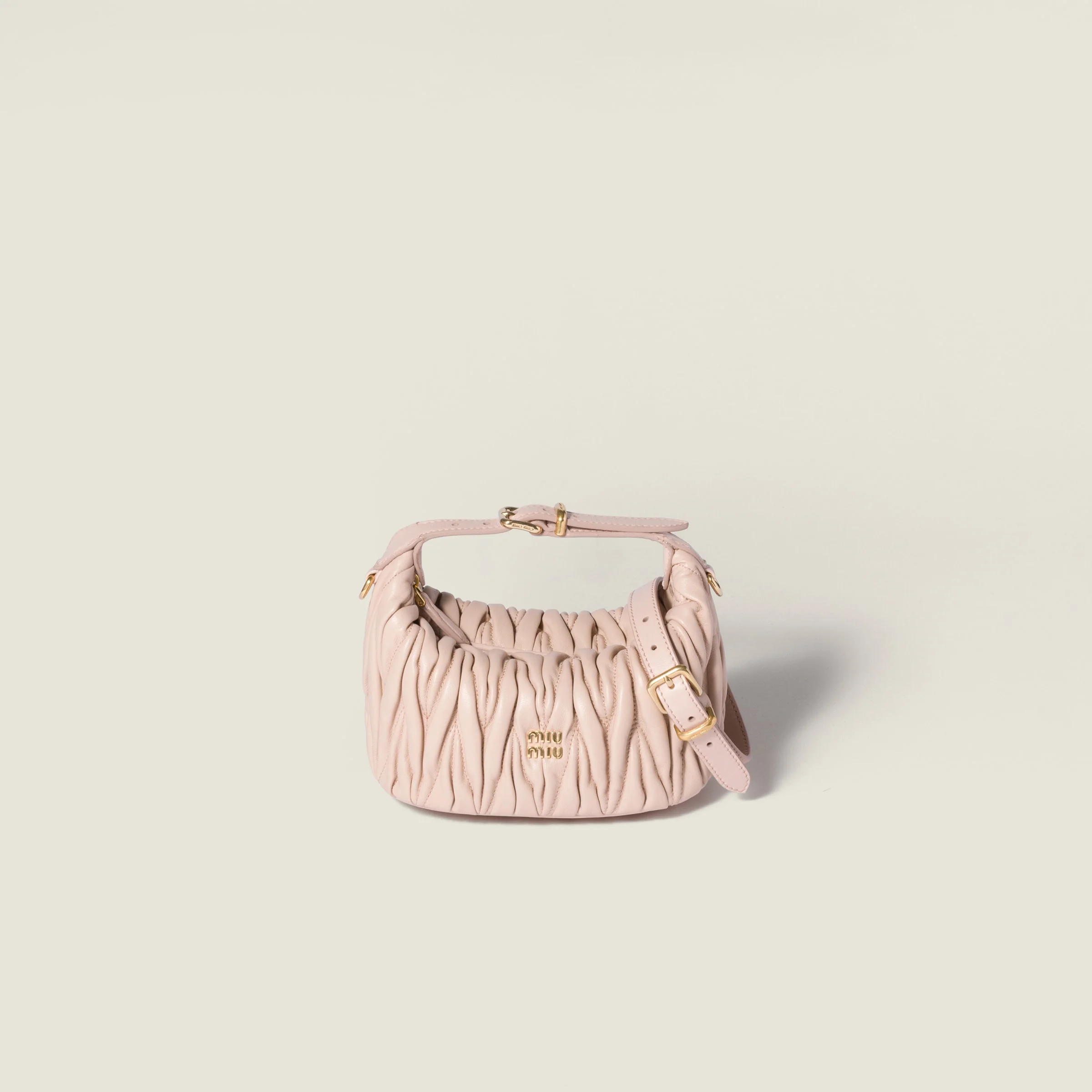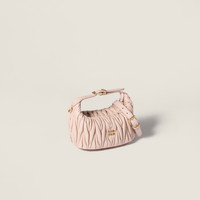 The matelasse motif, an emblem of Miu Miu style, is renewed in the practical and functional design of this pouch, perfect for carrying by hand and enriched with precious finishes and the metal logo. - Product code: 5NE026_AFPP_F0236 - Matelasse workmanship - Adjustable leather handle - Zipper closure - Cotton satin lining - Metal lettering logo - Imported Height 8.5cm Width 15cm Length 8cm Materials Main material: Lambskin