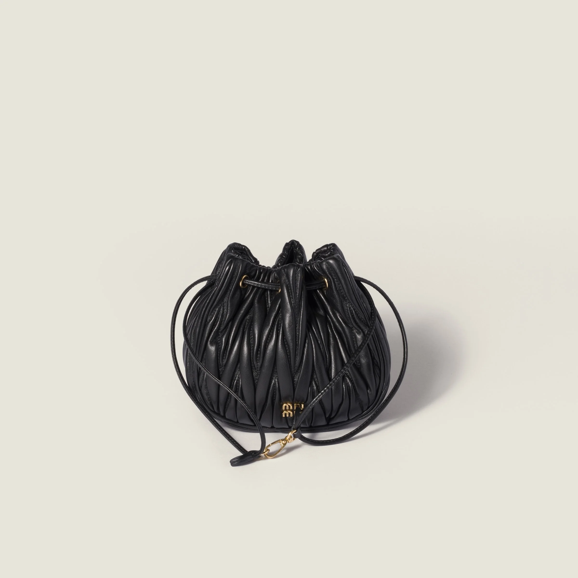 The matelasse motif, an emblem of Miu Miu style, is renewed in the practical and functional design of this pouch, enriched by the drawstring closure, precious finishes and metal logo. - Product code: 5ND022_AFPP_F0002 - Matelasse workmanship - Leather drawstring closure - Cotton satin interior - Metal lettering logo - Imported Height 14cm Width 16cm Length 7.5cm Materials Main material: Lambskin