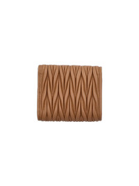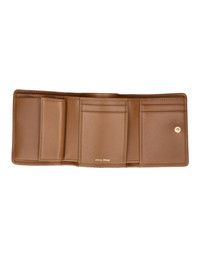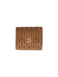 MIU MIU BROWN MATELASSE NAPPA LEATHER WALLET WITH FRONT BUTTON CLOSURE, GOLD METAL LETTERING LOGO ON THE FRONT, TRI-FOLD DESIGN, FOUR INNER CARD SLOTS, ONE INNER FLAP POCKET, ONE INNER BILL COMPARTMENT. PRODUCT INFO PRODUCT CODE 5MH033 AFPPF098L COMPOSITION: 100% LAMBSKIN SIZE AND FIT: H 8.5 X L 11 CM MADE IN: TURKEY