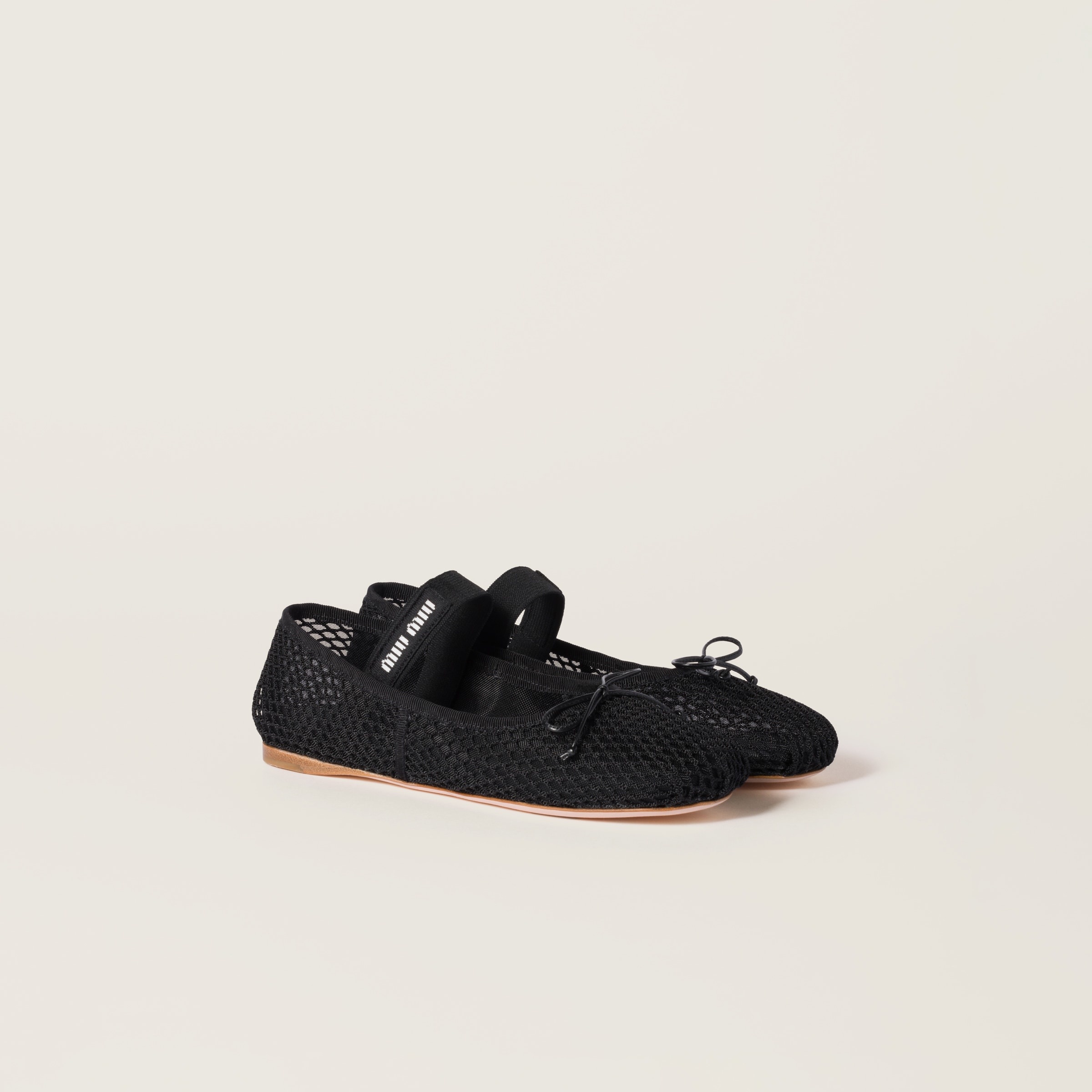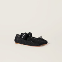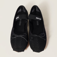 The classical style of the ballerina is reinterpreted in this mesh fabric version that enhances the lightness of the silhouette and underlines Miu Miu's bold and experimental essence. - Product code: 5F345E_099_F0002_F_005 - Upper with bow and logo-decorated elastic strap - Leather sole - Leather insole - Screen-printed logo - Imported Materials Main material: Polyamide