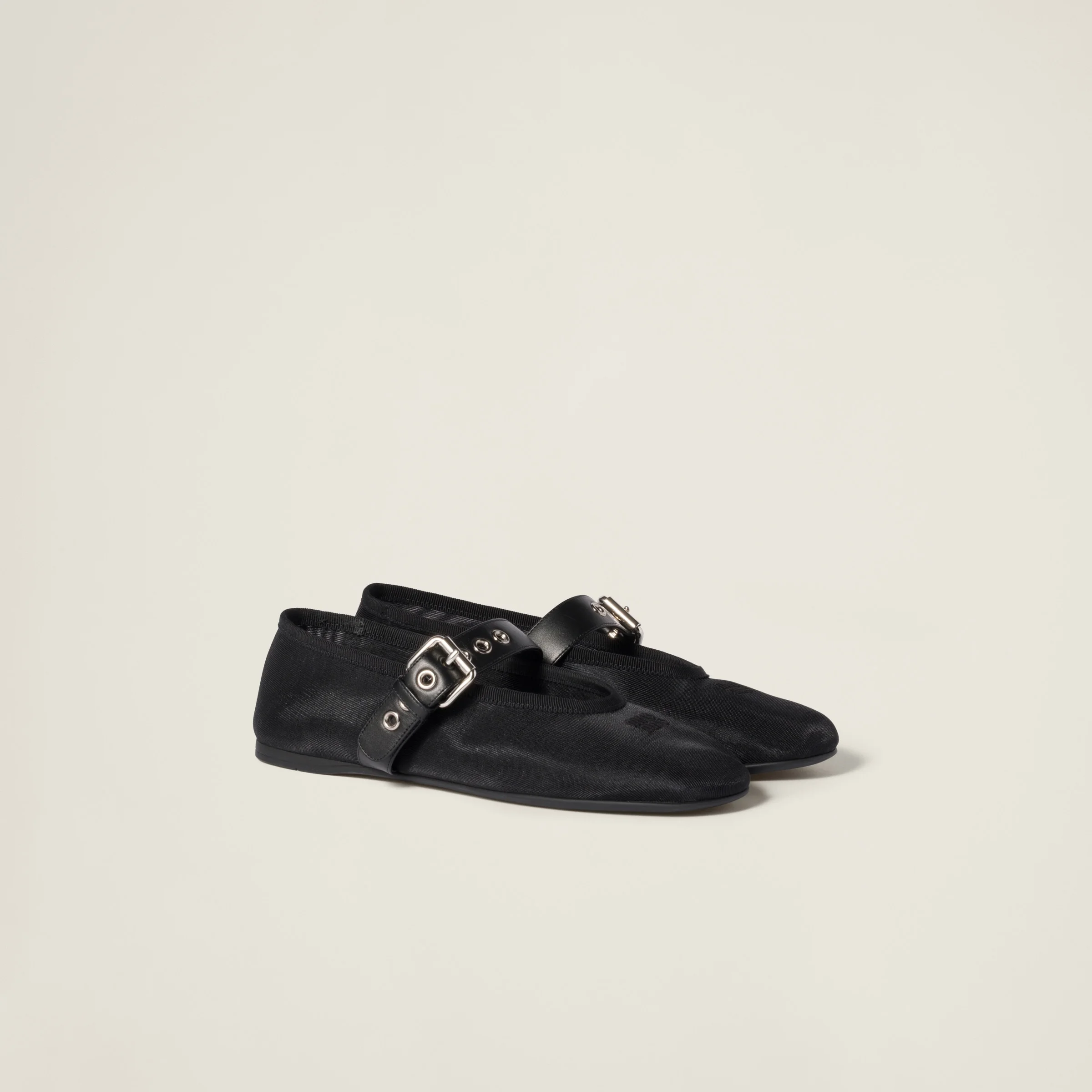 The iconic allure of the Miu Miu ballerina flat finds new expression in this summery mesh fabric version featuring an elegant texture and bold strap closure. - Product code: 5F373E_099_F0002_F_005 - Upper with strap - Rubber sole - Leather-covered insole - Logo embroidered on the upper and screen-printed on the insole - Imported Materials Main material: Polyester