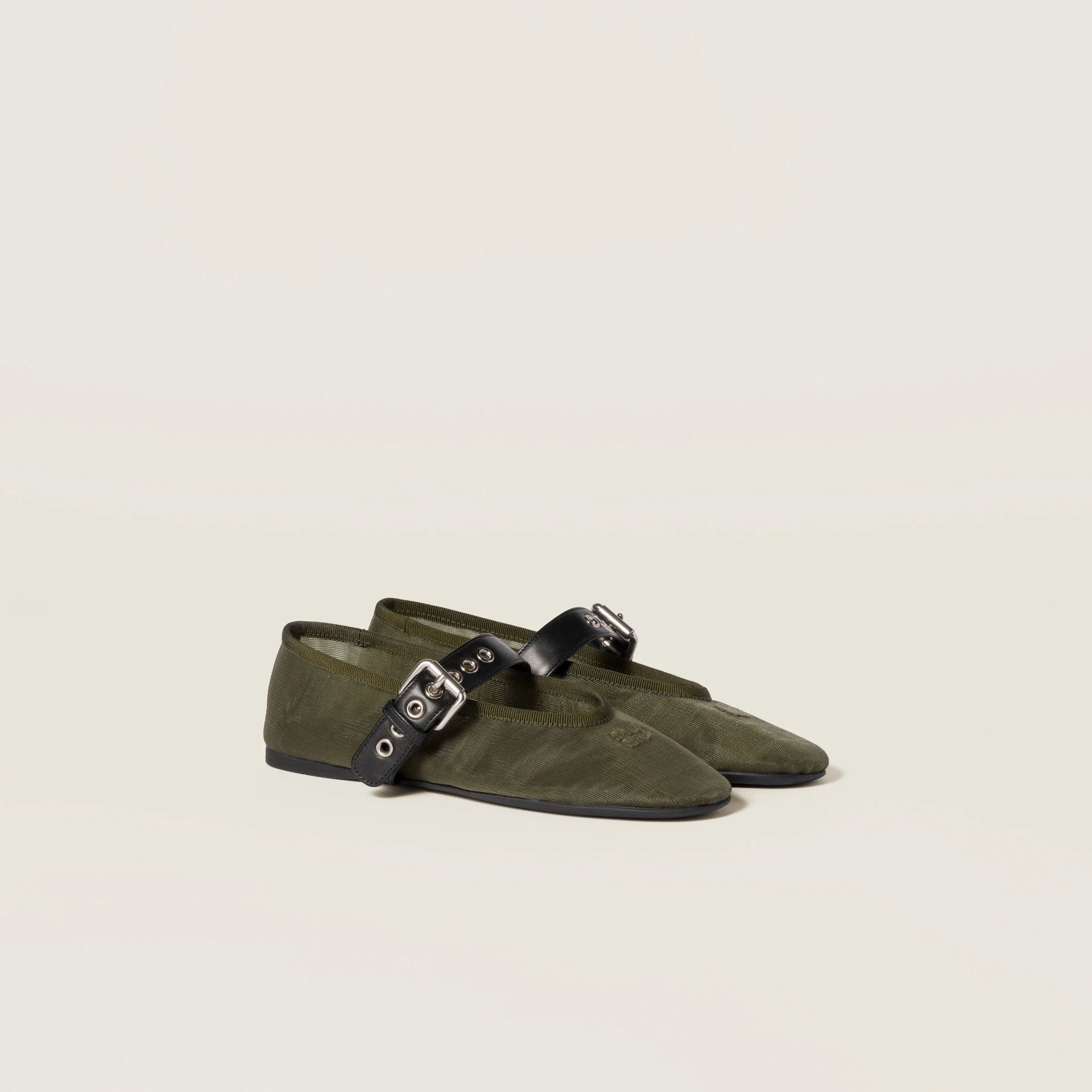 The iconic allure of the Miu Miu ballerina flat finds new expression in this summery mesh fabric version featuring an elegant texture and bold strap closure. - Product code: 5F373E_099_F0393_F_005 - Upper with strap - Rubber sole - Leather-covered insole - Logo embroidered on the upper and screen-printed on the insole - Imported Materials Main material: Polyester