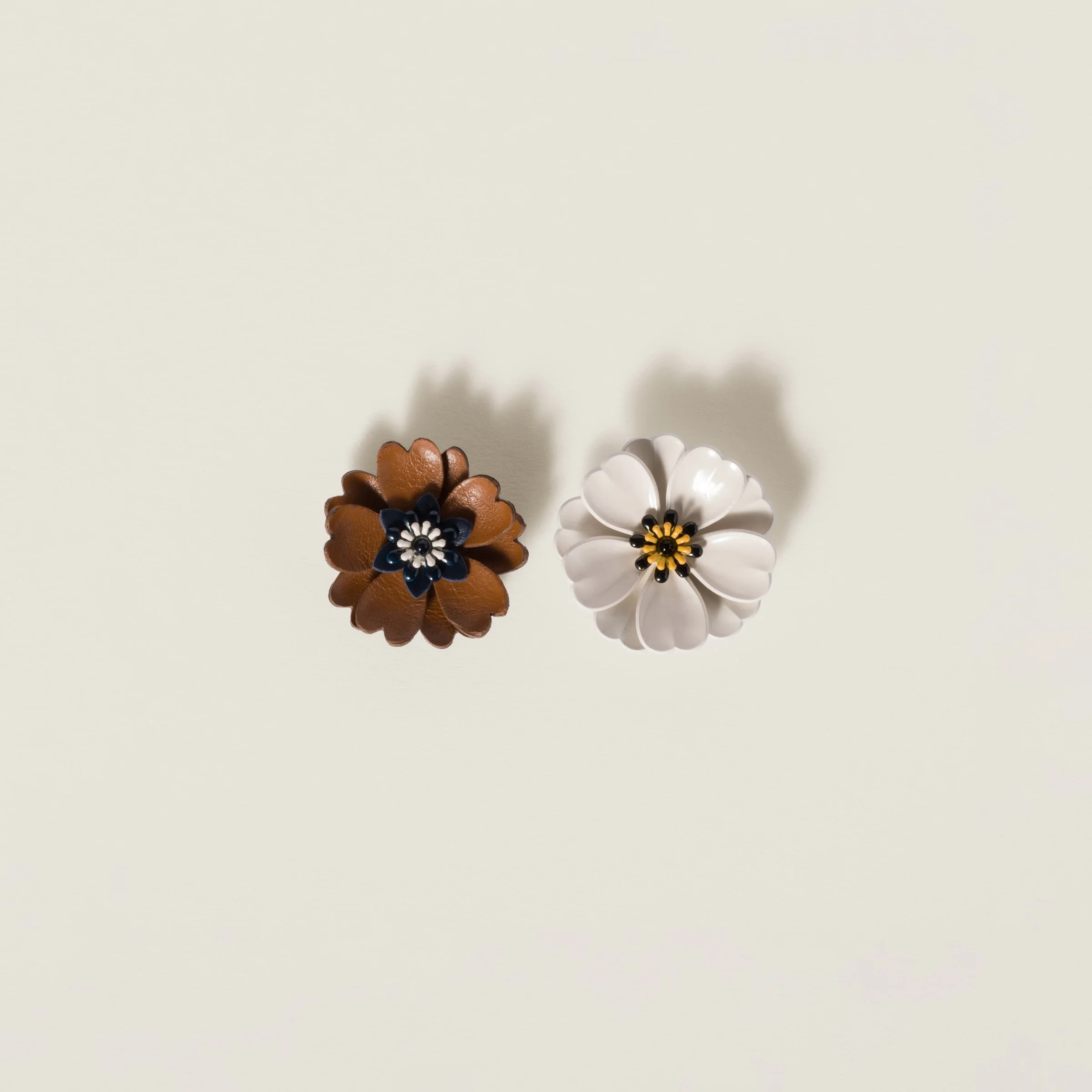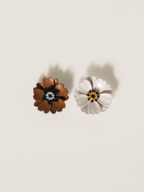 The charm of the floral world pays homage to Miu Miu style codes in the contrast between enameled metal and leather on these earrings with a precious, summer essence. - Product code: 5IO264_2IDA_F04NR - With enameled metal and leather floral elements - For pierced ears - Engraved logo on the back - Imported Width 3.3cm Materials Main material: Brass