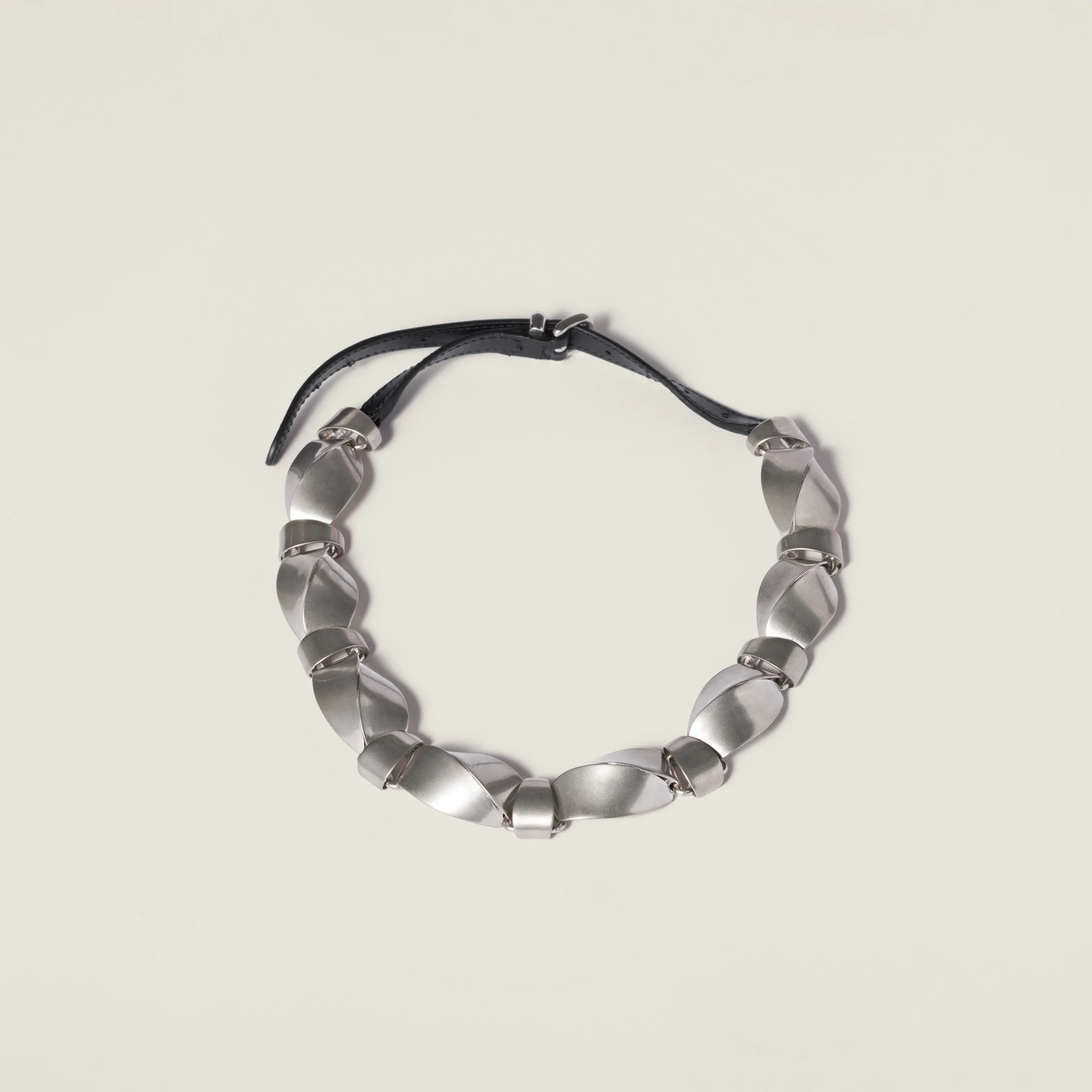 An elegant, lustrous sculptural motif adds movement to this necklace with leather details, a refined accessory that enhances versatile looks and sophisticated combinations. - Product code: 5IC284_2IF4_F04ZA - Metal buckle closure - Adjustable length - Metal loop with logo - Imported Materials Main material: Calfskin