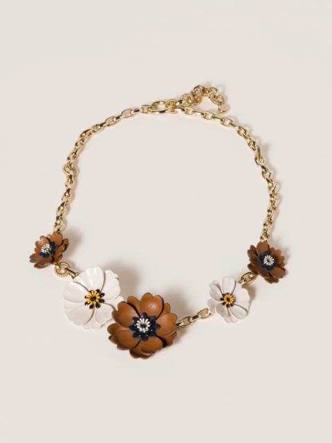 The charm of the floral world pays homage to Miu Miu style codes in the contrast between enameled metal and leather of this necklace with a precious, summer essence. - Product code: 5IC206_2IDA_F04R9 - Lobster claw clasp - Enameled metal and leather floral elements - Logo-engraved medal - Imported Width 72cm Materials Main material: Brass