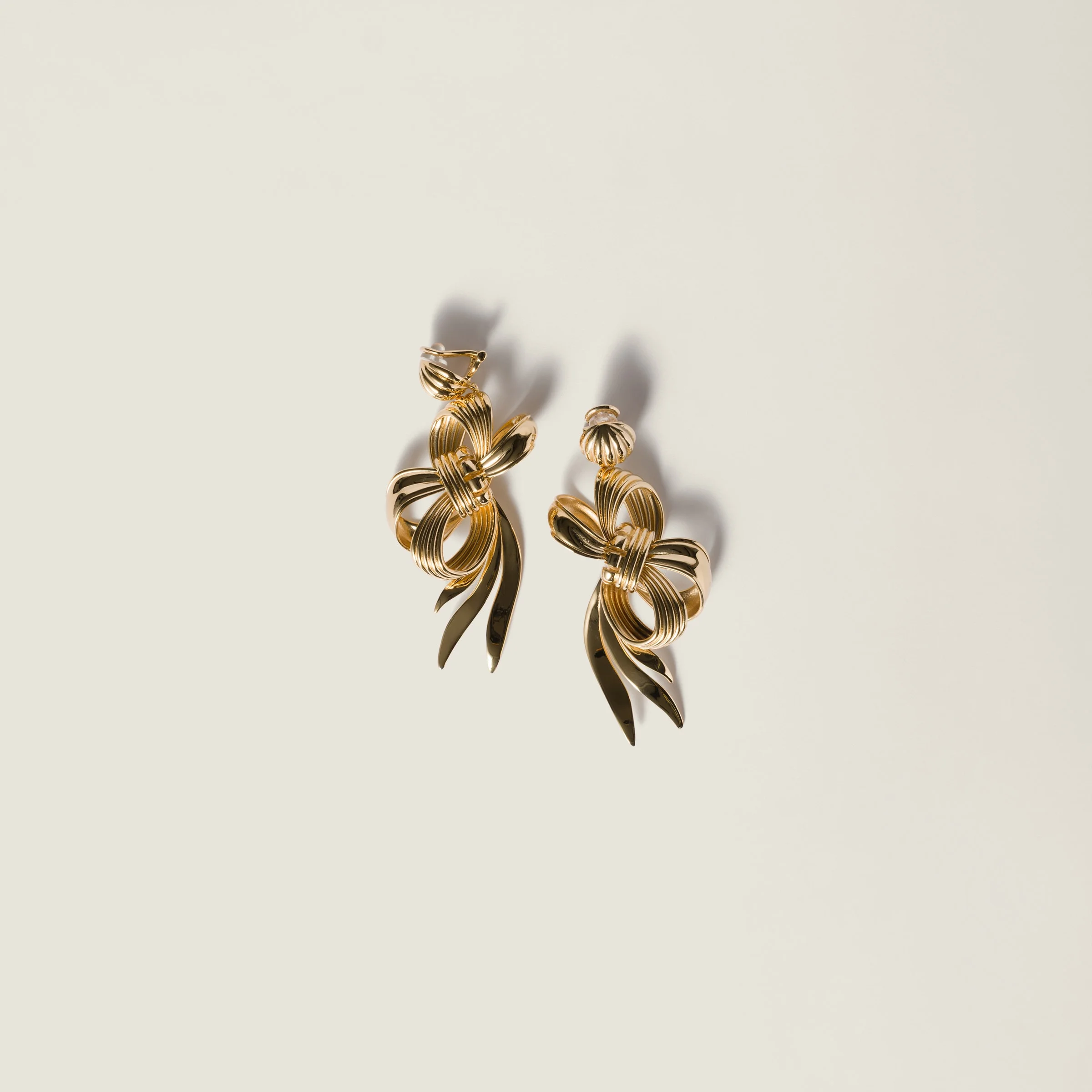 The bow design of these earrings blends classic inspirations and a contemporary spirit, with lustrous reflections that add movement and character to simple, feminine looks. - Product code: 5IO320_2IEV_F0056 - Metal clip earring back - Lasered logo on the back - Earring length: 9.13 cm. - Imported Height 9.13cm Width 4.12cm Materials Main material: Brass