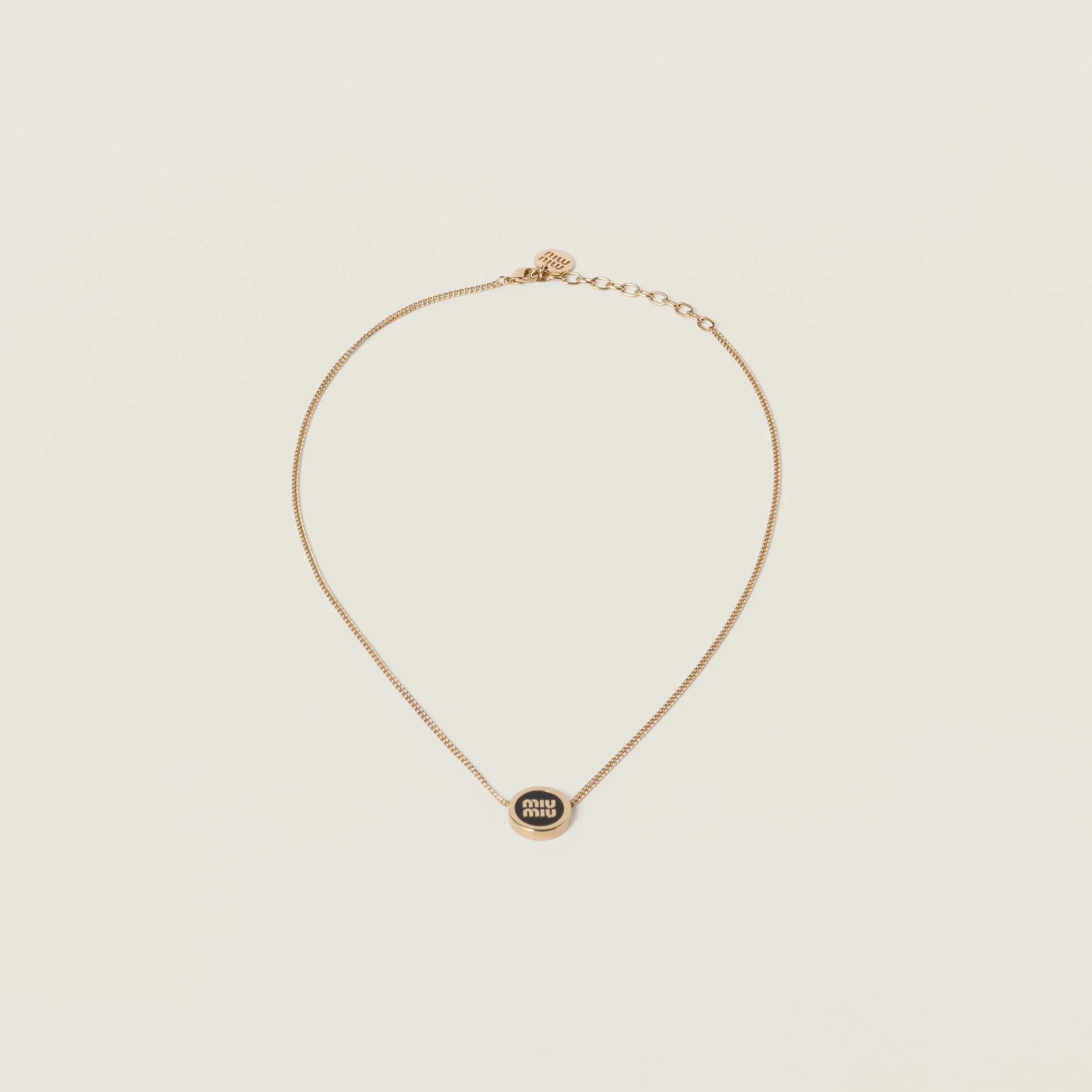 The Miu Miu logo stands out on the sleek lines of this metal necklace, thanks to its iconic character. - Product code: 5IC096_2F6T_F0002 - With enameled detail - Lobster claw clasp - Visible logo - Imported Width 48cm Materials Main material: Brass