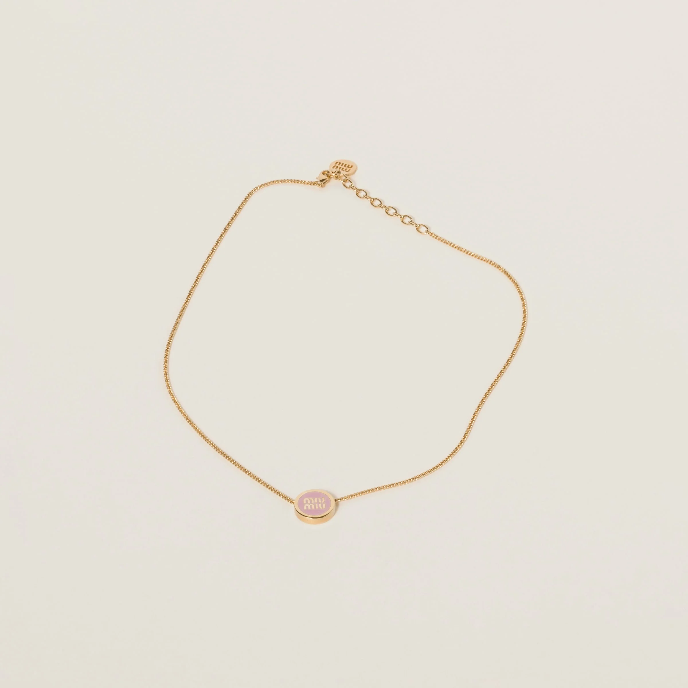 The Miu Miu logo stands out on the sleek lines of this metal necklace, thanks to its iconic character. - Product code: 5IC096_2F6T_F0615 - With enameled detail - Lobster claw clasp - Visible logo - Imported Width 48cm Materials Main material: Brass
