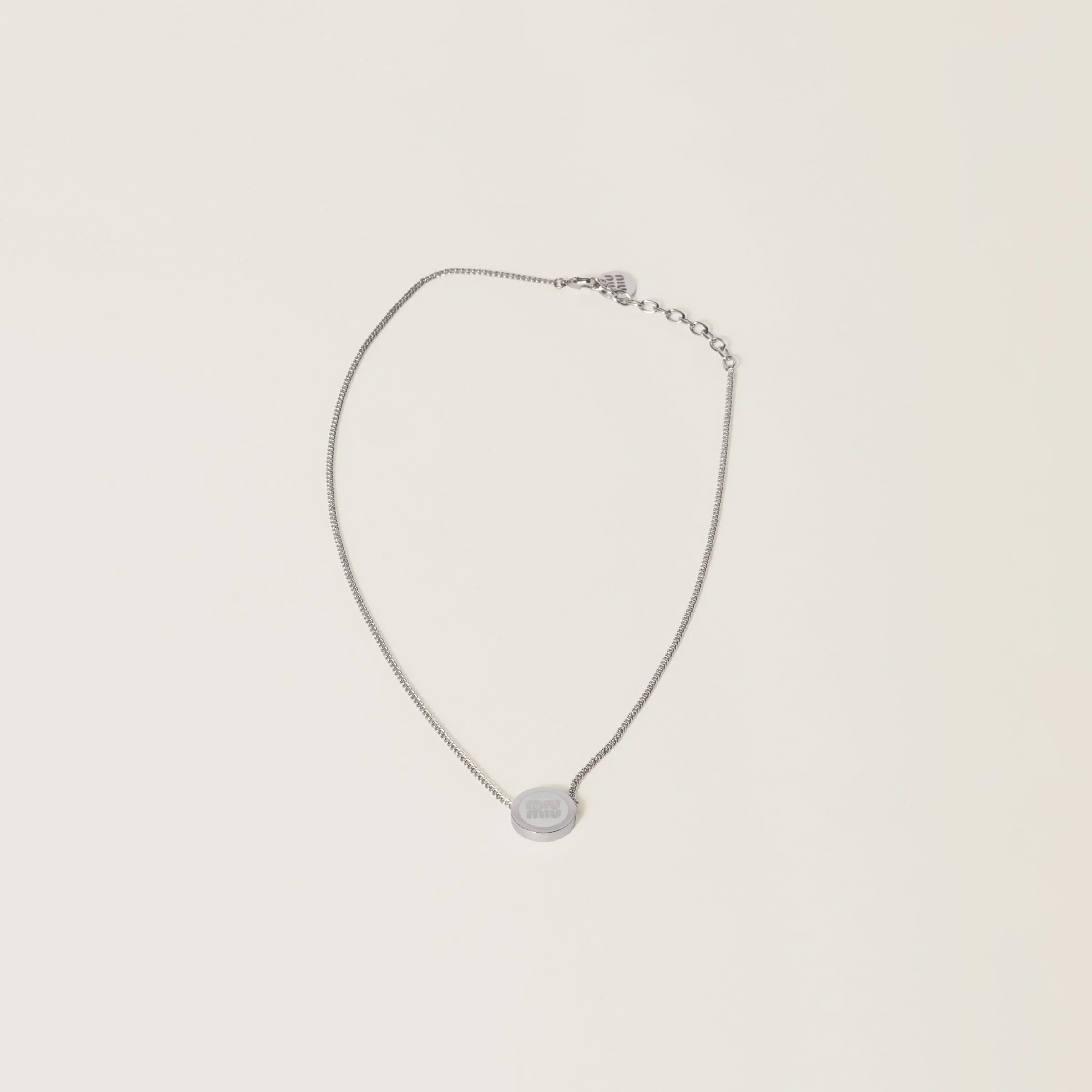 The Miu Miu logo stands out on the sleek lines of this metal necklace, thanks to its iconic character. - Product code: 5IC096_2F6T_F097W - With enameled detail - Lobster claw clasp - Visible logo - Imported Width 48cm Materials Main material: Brass