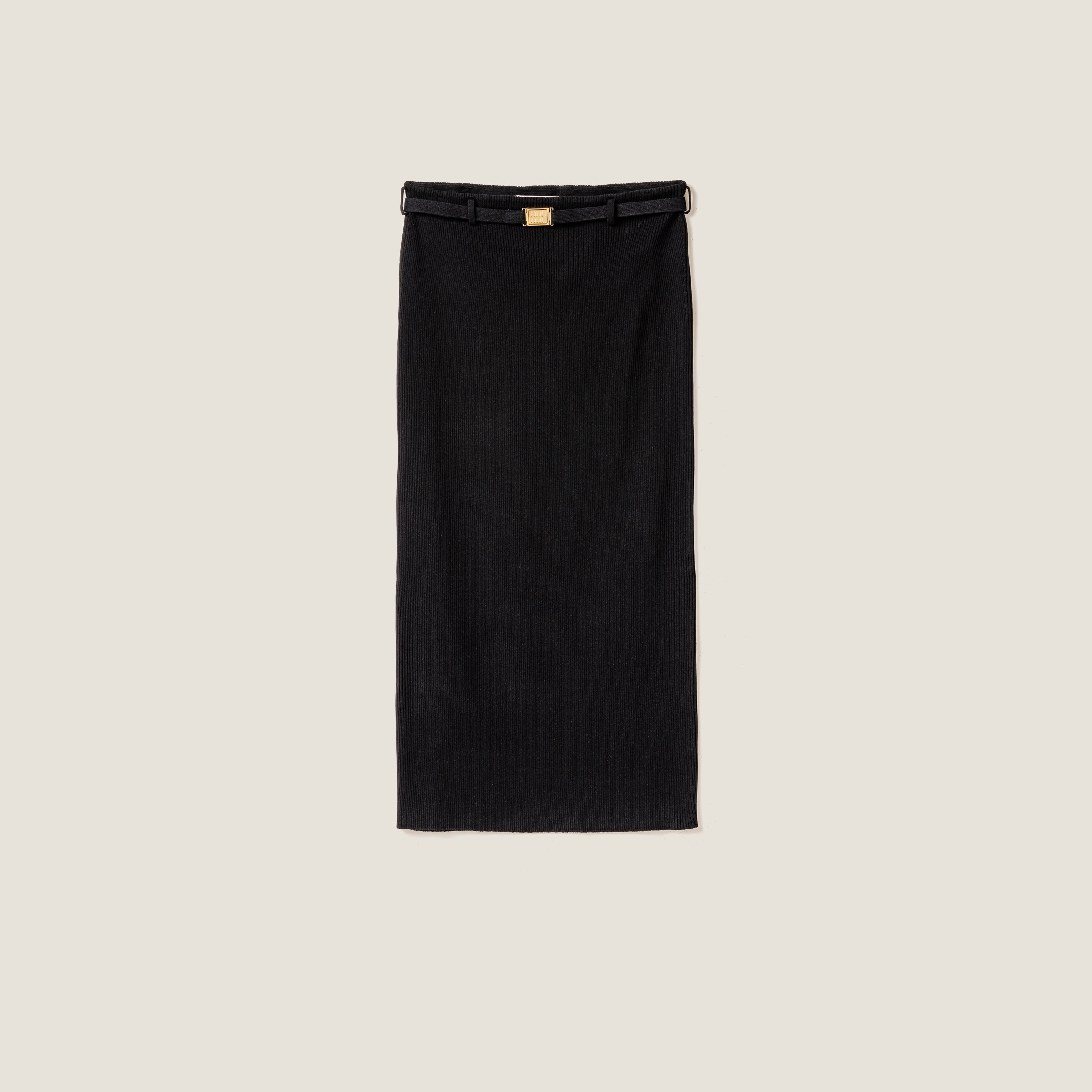 Miu Miu reinterprets the classic pencil silhouette in this viscose skirt. The ribbed knit gives the garment texture while the logo on the utility-inspired buckle adds its iconic signature to the design. - Product code: MMG496_13WV_F0002_S_OOO - Ribbed knit - Pencil silhouette - Logo on buckle - Imported - The model is 177 cm tall and wears a size 38 Height 72cm