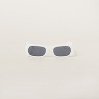 Acetate sunglasses with a soft rectangular design and sophisticated attitude. The narrow silhouette of the frame front is enhanced by the vertical Miu Miu logo that is integrated into the hinge of the straight temples. - Product code: SMU08Z_E142_F05S0_C_053 - Acetate frame front - Color: Chalk White - Frame compatible with graduated lenses - 100% UVA / UVB protection - Standard Fit - Lens-nose-temple measurement: 53-20-140 mm - Article comes with dedicated packaging - Other available colors - Imported