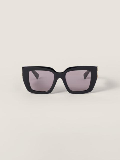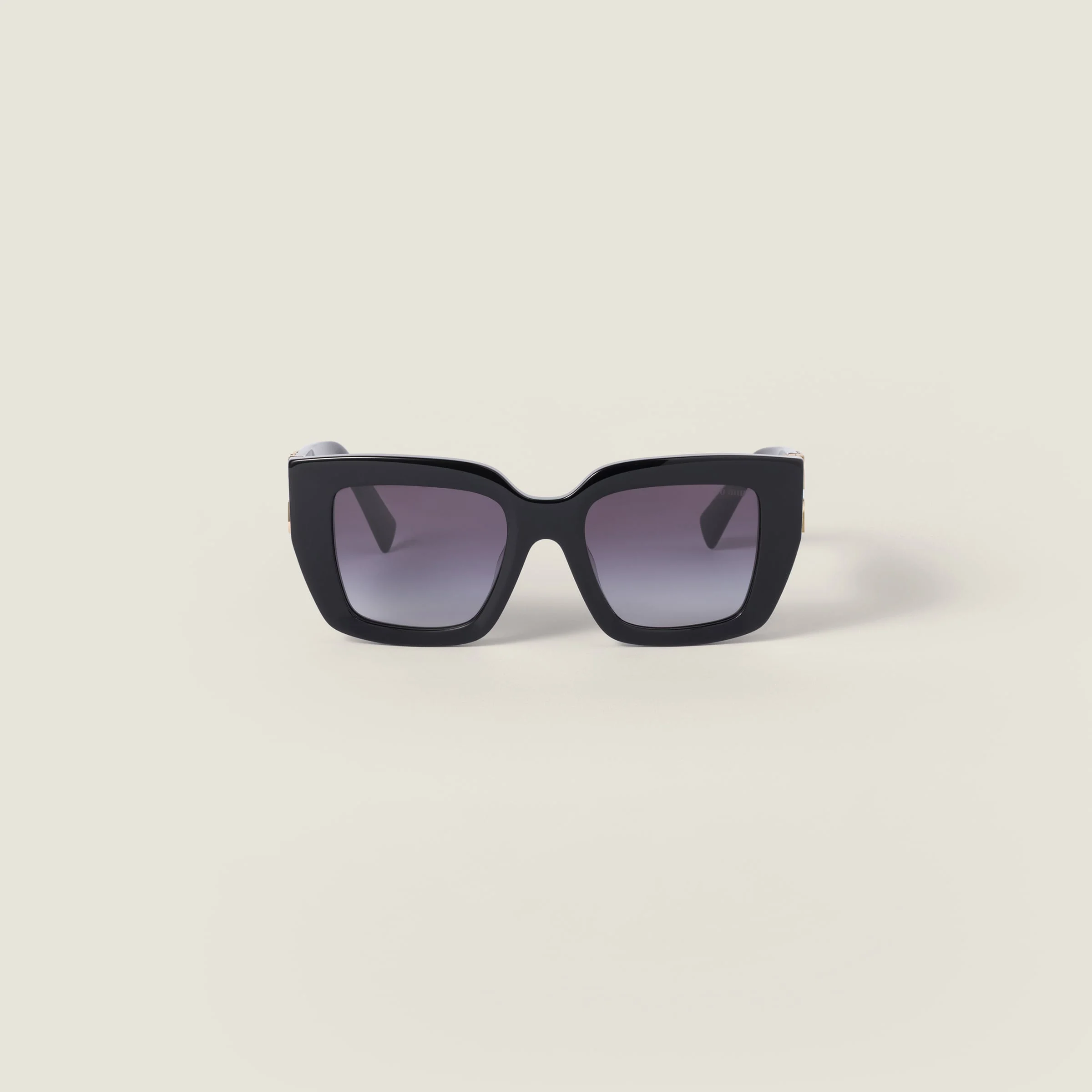 The Miu Glimpse sunglasses reinterpret the collection’s stylistic codes with low-set shapes and streamlined profiles. The rectangular acetate frame is highlighted by the vertical Miu Miu logo integrated into the hinge of the thick temples. - Product code: SMUB05_E16K_FE90A_C_051 - Acetate frame front - recycled black color - Frame compatible with graduated lenses - 100% UVA/UVB protection - Standard Fit - Lens-nose-temple measurement: 51-21-135 mm - Article comes with dedicated packaging - Imported Materials Main material: Acetate